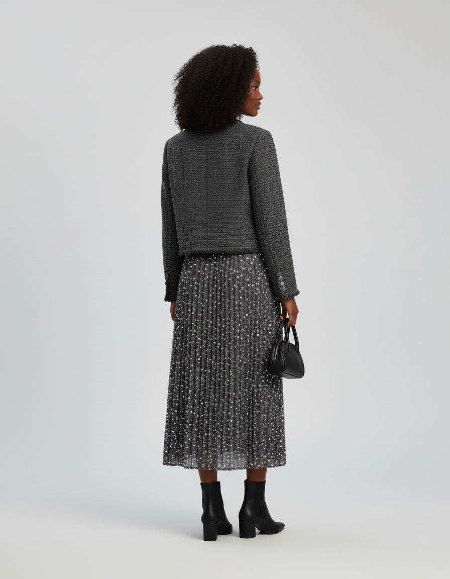 La Jupe Longue Grise Pailletée Élégante est conçue pour sublimer chaque silhouette, transformant les occasions spéciales en moments mémorables. Pour une soirée mondaine, associez-la à un top en soie délicat et des escarpins pour une allure raffinée. Pour un cocktail plus décontracté ou un dîner entre amis, osez la combiner avec un blazer structuré et des bottines élégantes, comme dans notre look signature. Son gris scintillant s'harmonise parfaitement avec des tons neutres ou des touches de couleur audacieuses, offrant une infinité de possibilités pour exprimer votre style unique.