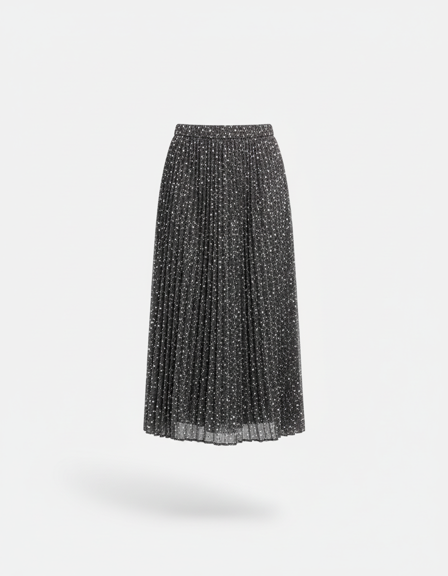 Cette jupe présente une teinte grise et une longueur atteignant la cheville. Elle est ornée de petits motifs brillants répartis sur l'ensemble du tissu.