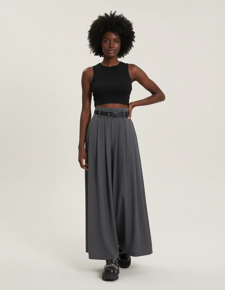 Jupe Longue Grise Plissée Chic à Taille Haute