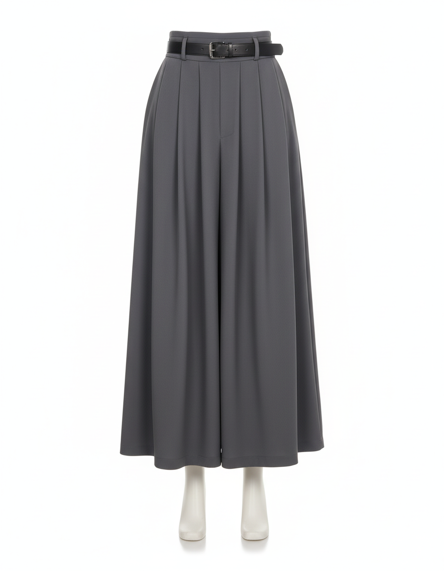 Cette jupe est une pièce longue de couleur grise. Elle présente des plis structurés à partir de la taille haute.