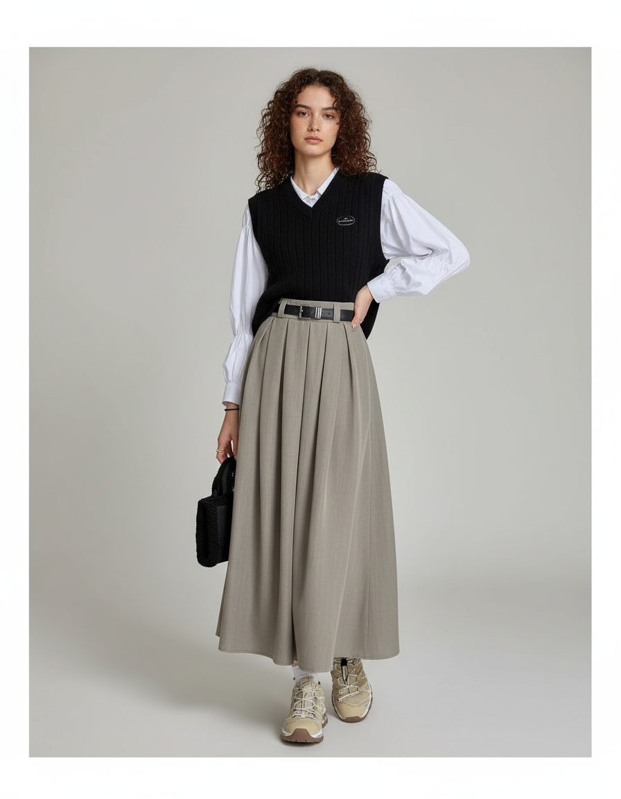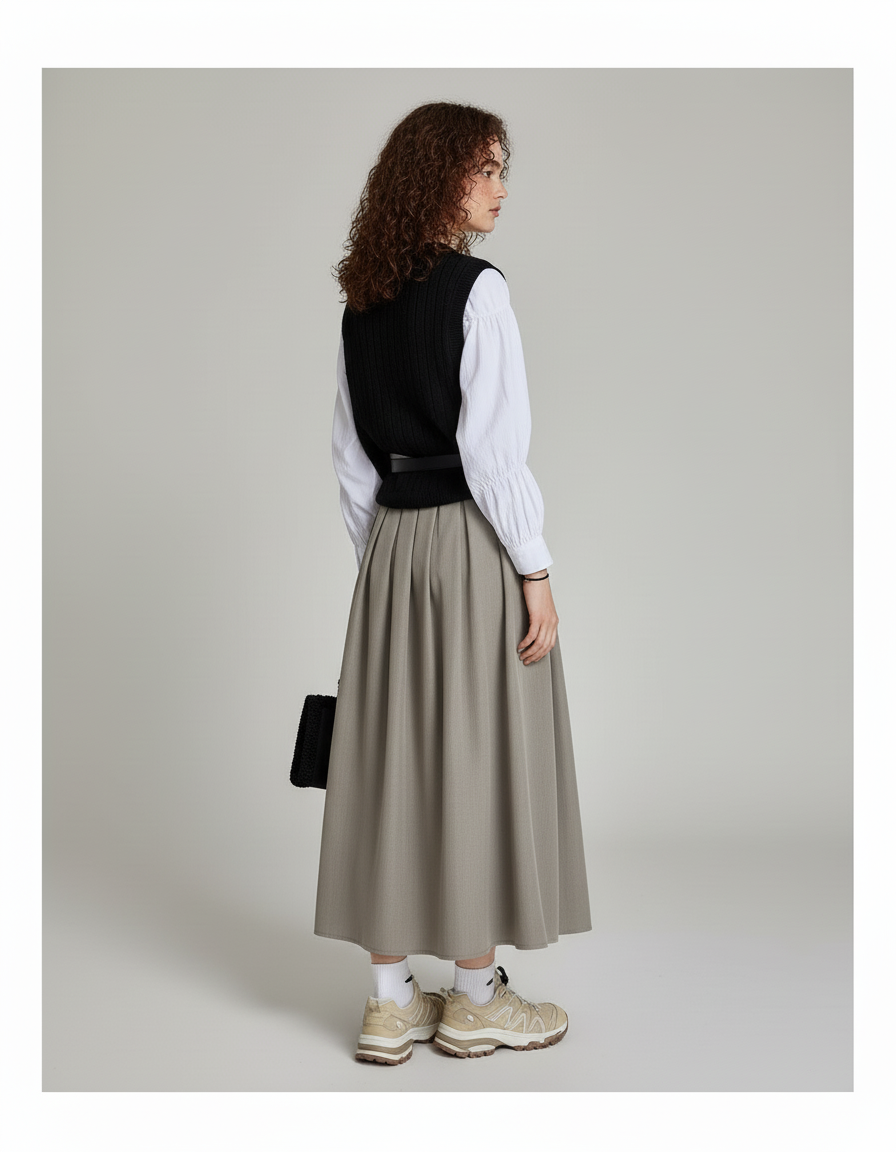 Découvrez la jupe longue plissée grise, une pièce maîtresse conçue pour s'adapter à toutes les facettes de votre vie. Pour un look décontracté chic, mariez-la à un chemisier blanc et un pull sans manches en maille fine, comme proposé ici, complété par des baskets épurées pour une allure moderne et confortable. En journée de travail, transformez-la avec un blazer ajusté et des bottines élégantes. Pour une occasion spéciale, associez-la à un top en soie raffiné et des talons aiguilles, et elle révélera son potentiel sophistiqué, vous garantissant une allure impeccable en toutes circonstances.
