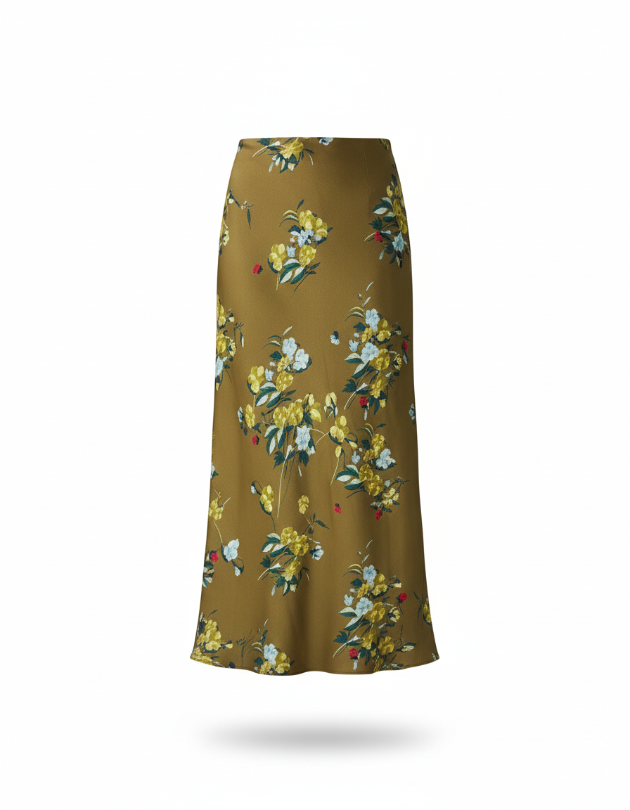 Cette Jupe Longue Grosses Fleurs est caractérisée par son motif floral. Le vêtement est de couleur kaki avec des motifs de fleurs.