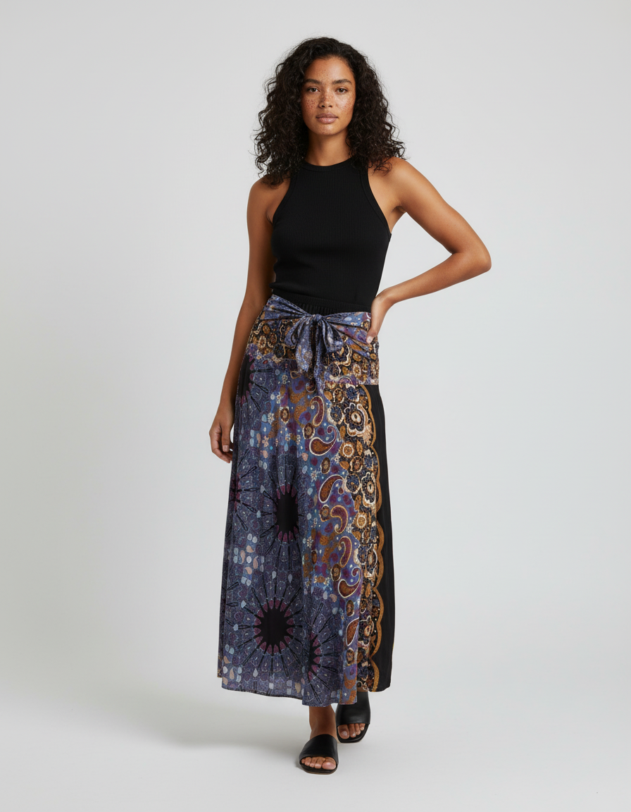 Avec ses motifs colorés envoûtants, cette jupe est une toile pour votre créativité. Pour une escapade estivale ou un déjeuner en terrasse, associez-la à un simple débardeur noir et des sandales plates pour un look bohème chic décontracté. En soirée, transformez-la avec des talons compensés, un top en soie et quelques bijoux dorés pour une silhouette sophistiquée et captivante. Idéale pour les voyages, elle se froisse peu et offre une polyvalence qui accompagnera toutes vos aventures avec style.