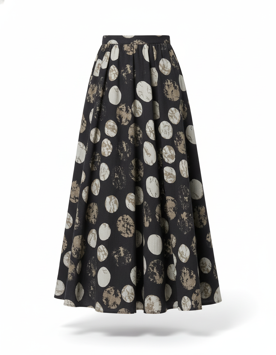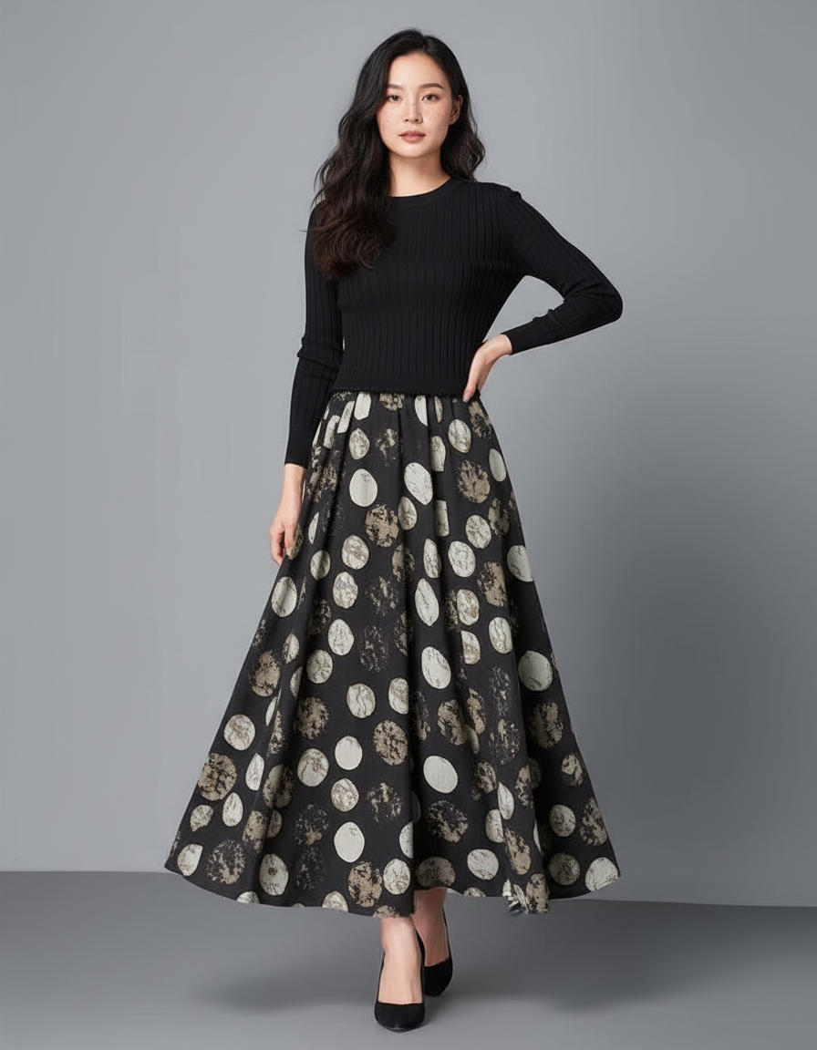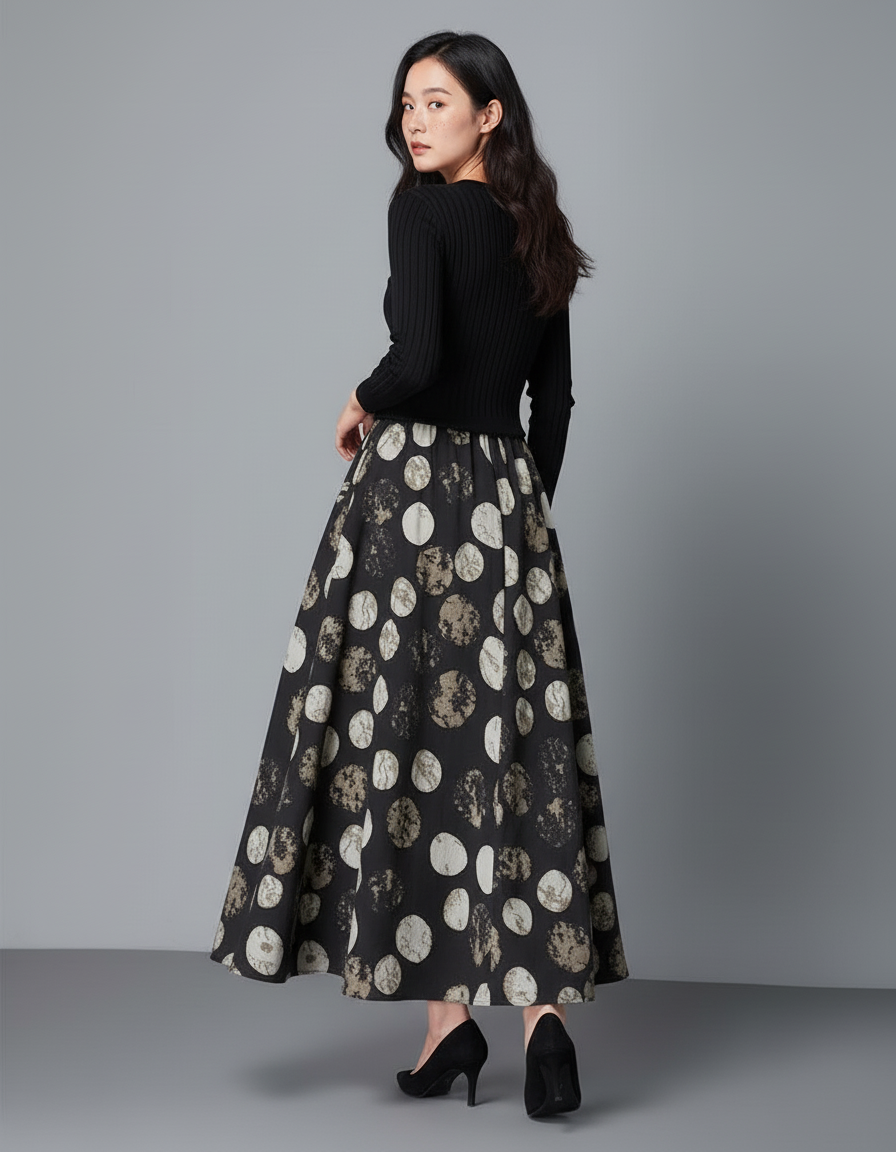 The person in the image is wearing a chic and coordinated outfit. She has on a **black, long-sleeved, ribbed knit top** with a crew neck. Paired with the top is a **black, full-length (midi/maxi) A-line skirt** that features a distinctive pattern of large, irregular circles. These circles are in varying shades of off-white, cream, and muted brown/taupe, and they appear to have a textured or distressed finish. On her feet, she is wearing **black closed-toe heels**, likely pumps.
