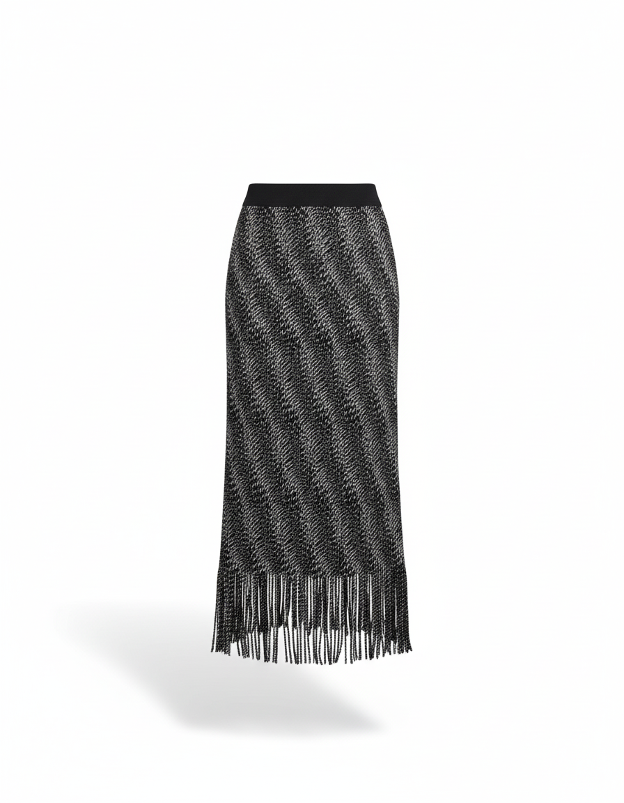 Ce qui la différencie réside dans son design unique : un imprimé graphique subtil et raffiné, allié à des franges délicates qui dansent à chaque pas, ajoutant une dimension de mouvement et de légèreté. Cette jupe n'est pas qu'un vêtement, c'est une déclaration de style, un équilibre parfait entre l'audace contemporaine et le luxe discret. Oubliez les jupes ordinaires ; avec cette création haut de gamme, vous investissez dans une pièce qui magnifie votre démarche et révèle votre goût pour l'exclusivité.