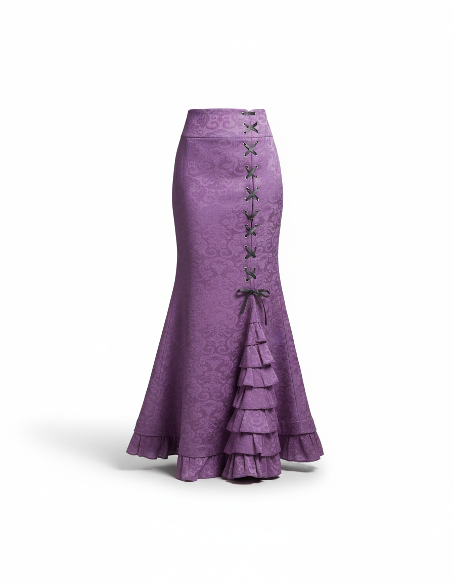 Ce qui distingue cette jupe, c'est son tissu jacquard violet profond, orné de motifs délicats qui captent la lumière à chaque mouvement. Sa coupe sirène élégante est sublimée par une fente latérale audacieuse, lacée de rubans noirs et révélant des volants en cascade, créant un effet visuel spectaculaire. Chaque détail, du laçage discret aux volants structurés, a été pensé pour offrir une pièce à la fois classique et résolument contemporaine, garantissant un impact visuel sans pareil.