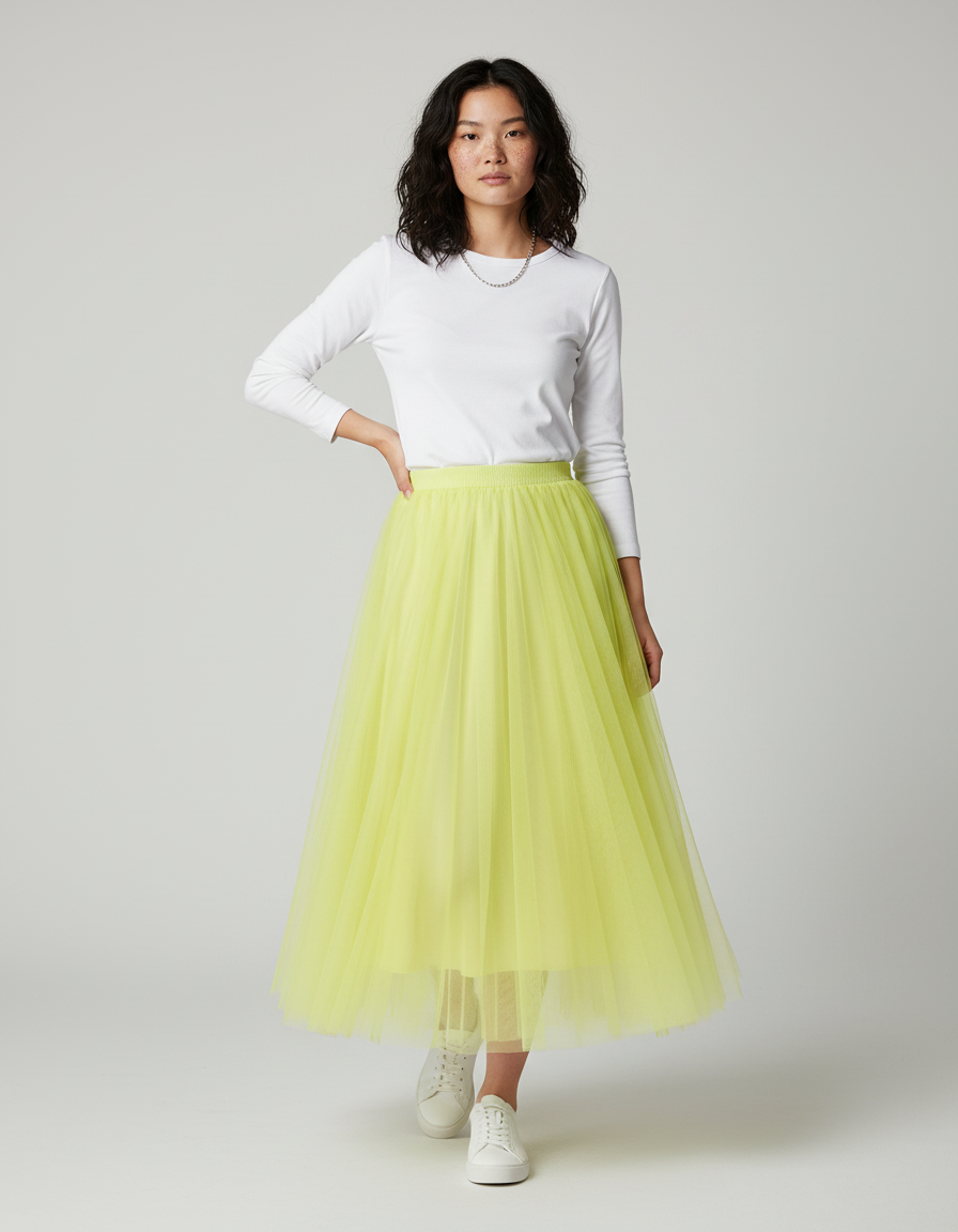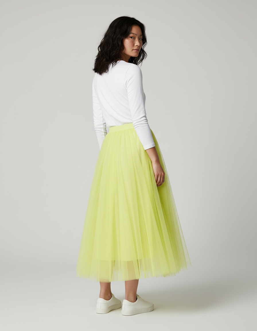 Conçue dans un tulle aérien de qualité supérieure, notre Jupe Longue Jaune Fluo vous enveloppe d'une légèreté incomparable. Sa coupe ample et bouffante est pensée pour une liberté de mouvement absolue, vous permettant de danser, marcher et vivre pleinement sans aucune contrainte. Le tombé impeccable de cette pièce sublime votre silhouette, créant un volume élégant et structuré qui oscille gracieusement à chacun de vos pas, affirmant votre présence avec distinction et confort.