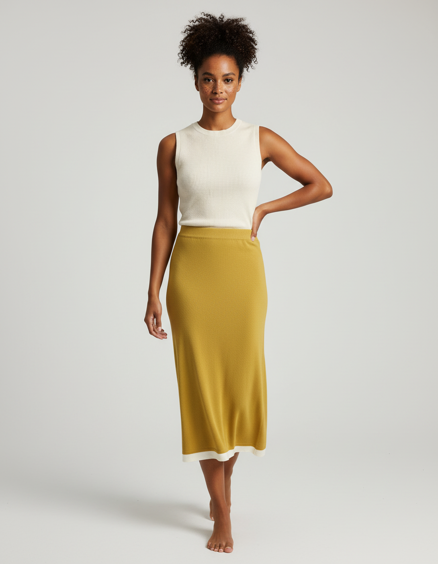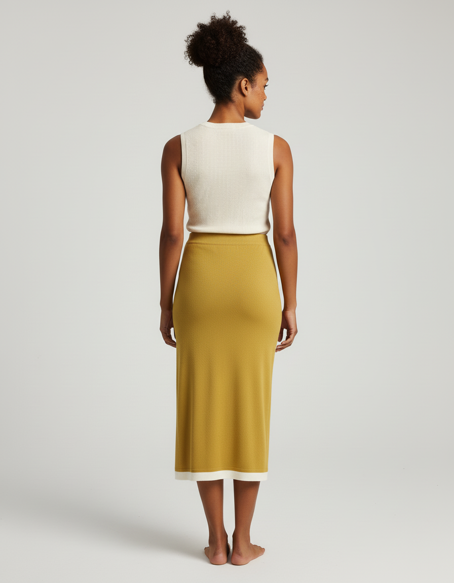 Conçue dans une maille fine et respirante, notre Jupe Longue Jaune Pâle épouse délicatement vos formes sans jamais contraindre. Son tombé impeccable met en valeur votre silhouette avec une élégance naturelle, tandis que sa texture douce procure une sensation de seconde peau. Idéale pour les journées estivales, elle offre une liberté de mouvement absolue, vous permettant de vaquer à vos activités avec aisance et confiance, du matin jusqu'au soir. Oubliez les tissus rigides et adoptez la fluidité.