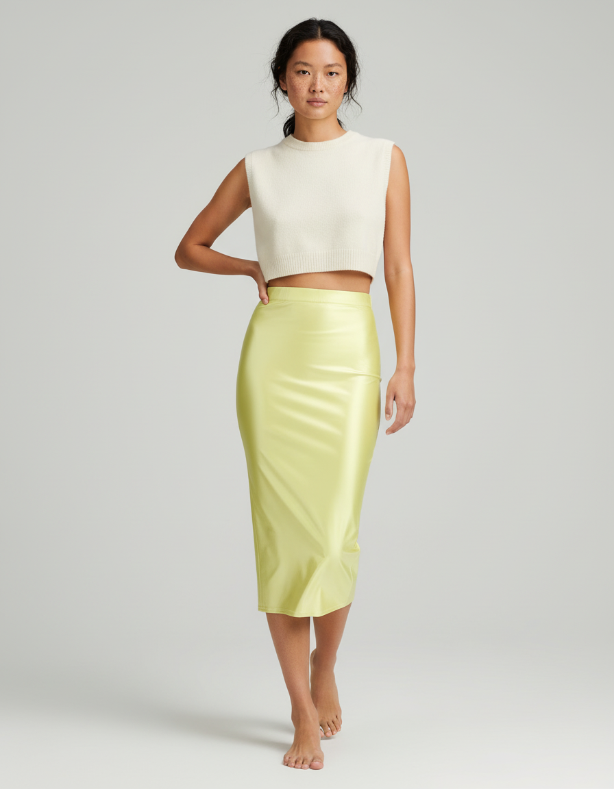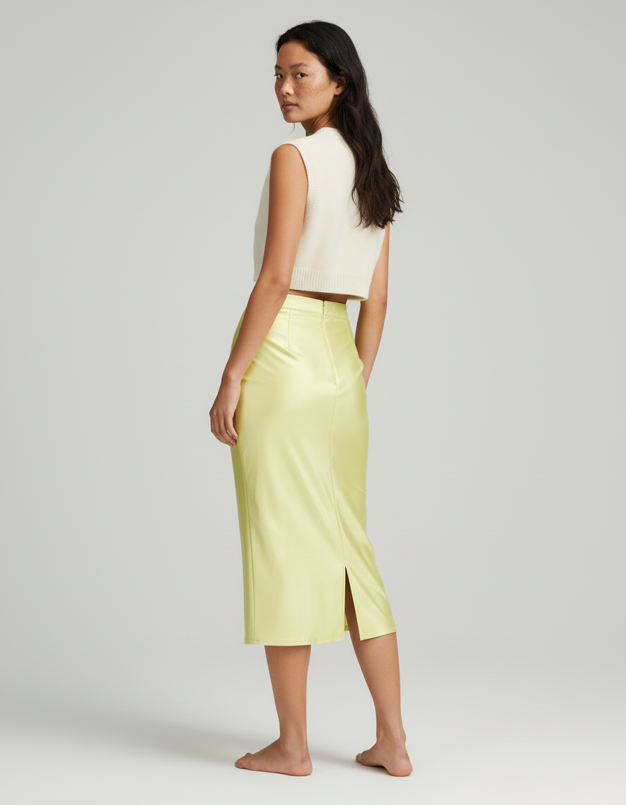 Ce qui distingue notre jupe tube, c'est son équilibre parfait entre modernité et intemporalité. Loin des standards, son jaune citron subtil apporte une touche de fraîcheur unique, vous permettant de vous démarquer avec goût. La qualité exceptionnelle de son satin garantit non seulement une brillance sophistiquée, mais aussi une durabilité remarquable. Portez-la avec un pull en maille fine pour un look décontracté chic ou avec un chemisier en soie pour une élégance sophistiquée. Cette jupe est l'investissement parfait pour une allure luxueuse et contemporaine, adaptée à toutes les occasions.