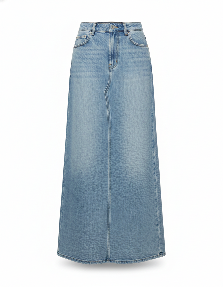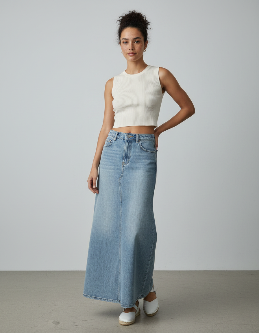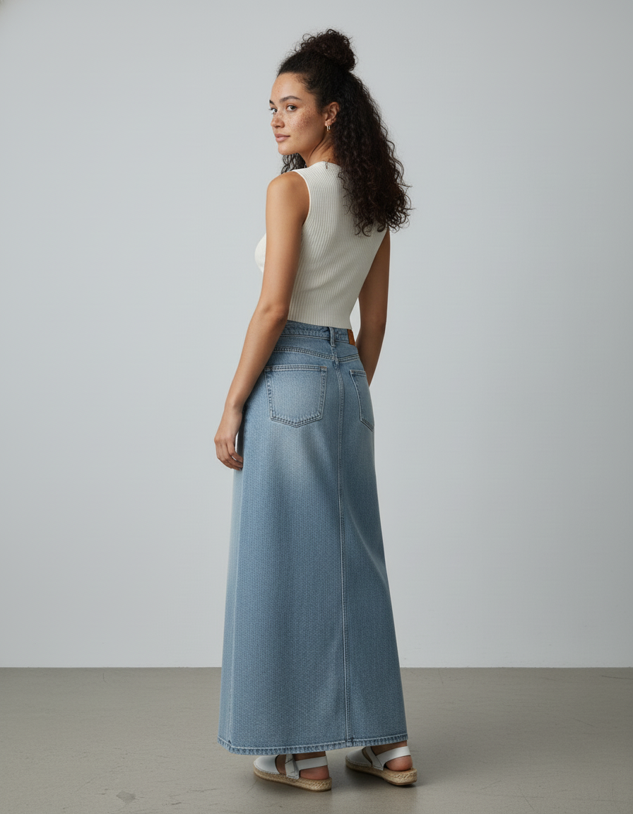 Cette jupe longue en jean clair est un essentiel polyvalent pour une allure décontractée et chic.