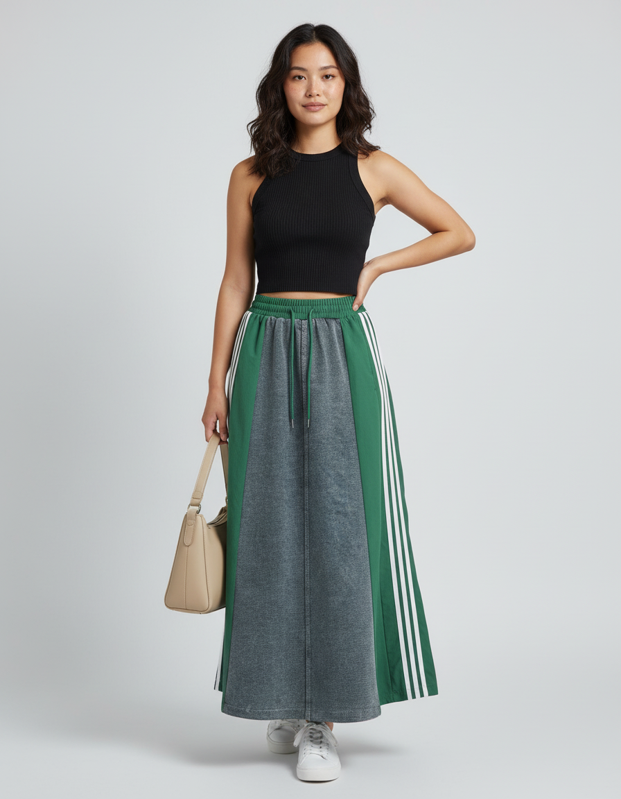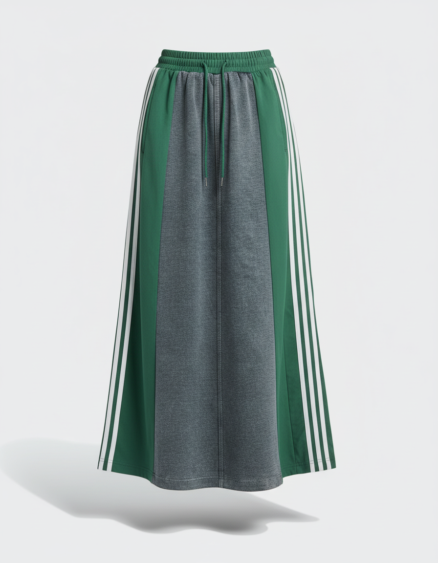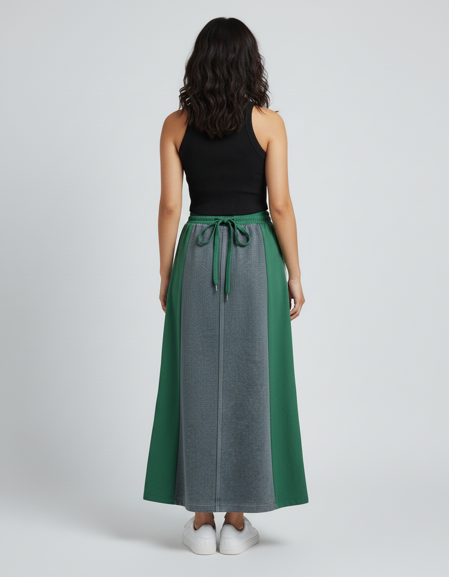 Cette jupe longue présente un design bicolore avec des panneaux latéraux verts et une section centrale gris chiné. Elle est dotée d'une taille à cordon de serrage et de bandes blanches sur les côtés.