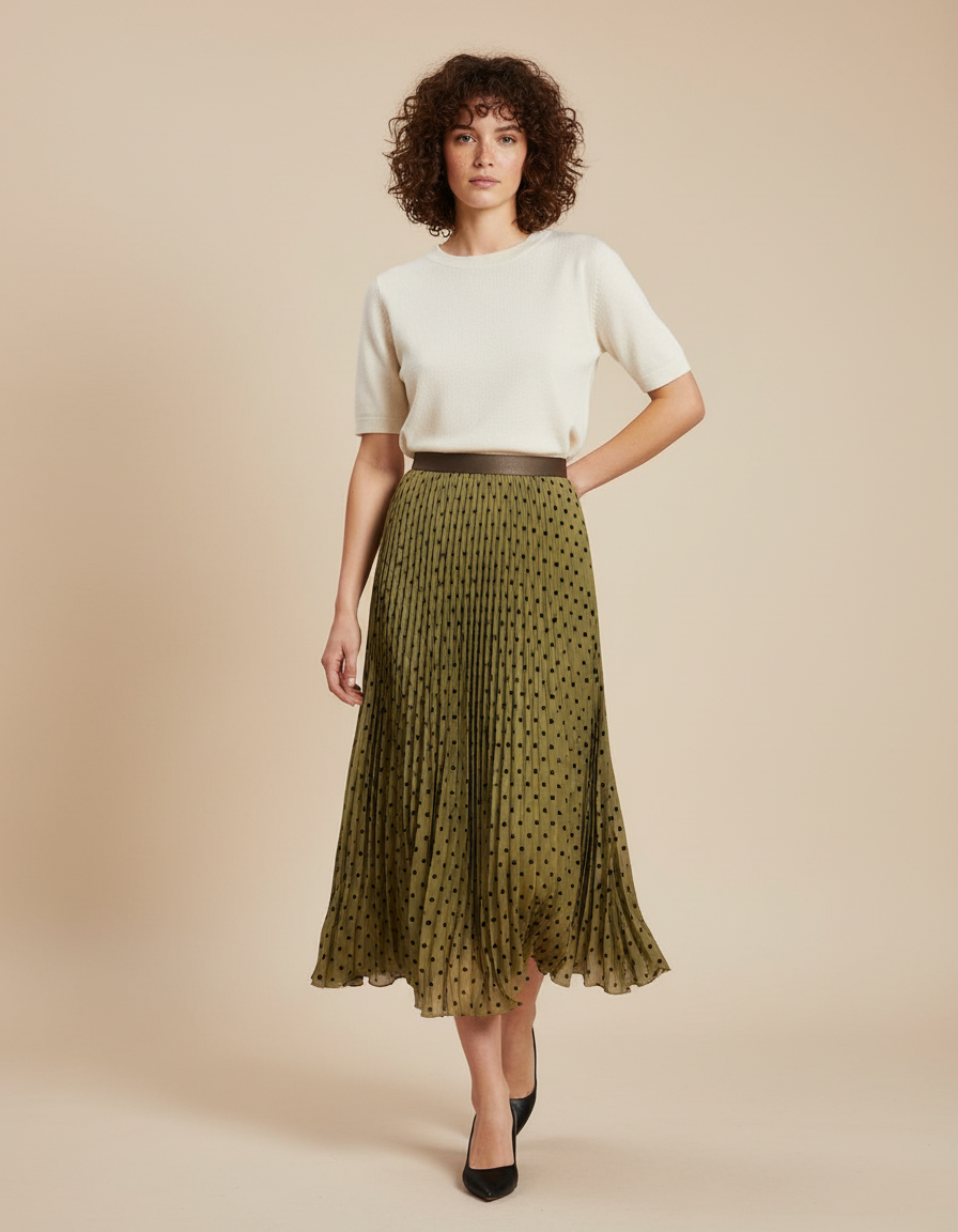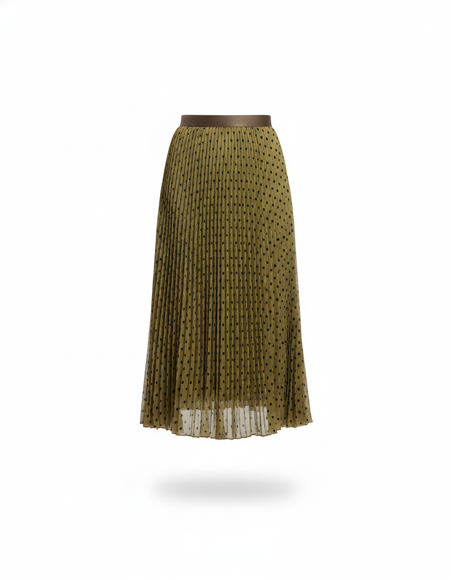 L'Élégance Fluide : Jupe Plissée Kaki à Pois