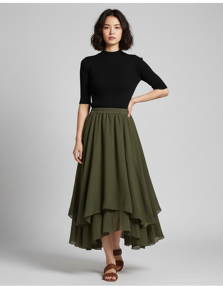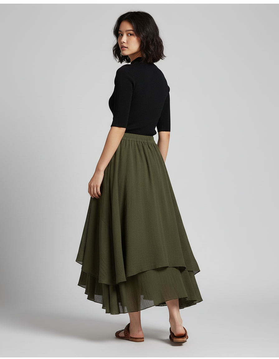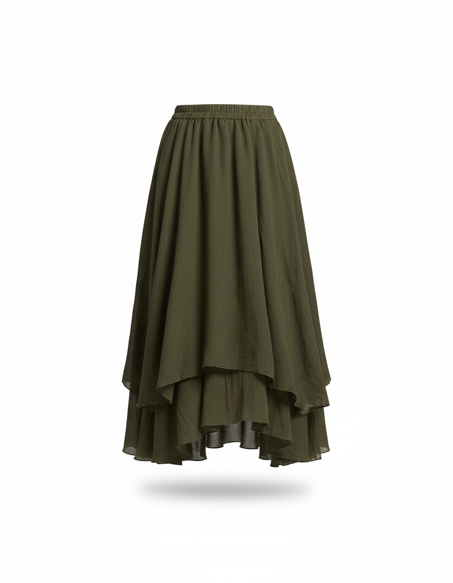 Jupe Longue Kaki Fluide Élégante : L'Art du Mouvement et de l'Élégance