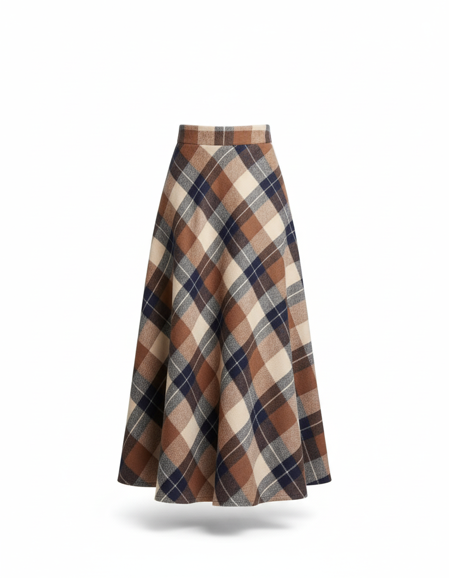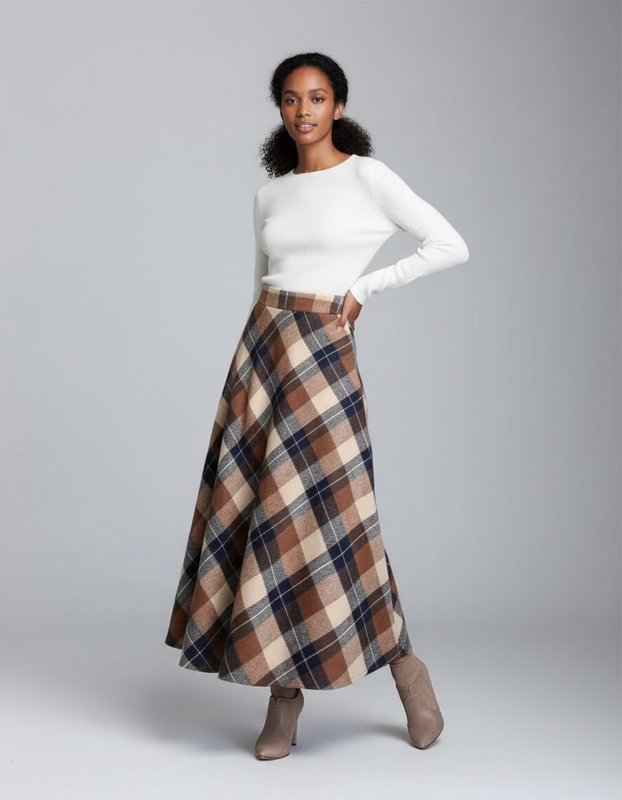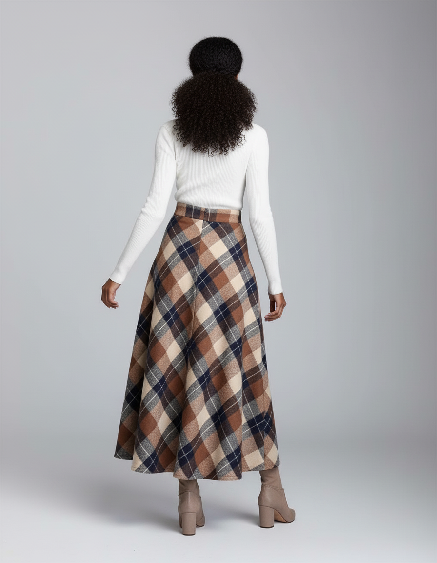 Cette jupe est un vêtement long confectionné en laine bouillie, présentant un motif à carreaux. Sa coupe est évasée et elle descend jusqu'aux chevilles.
