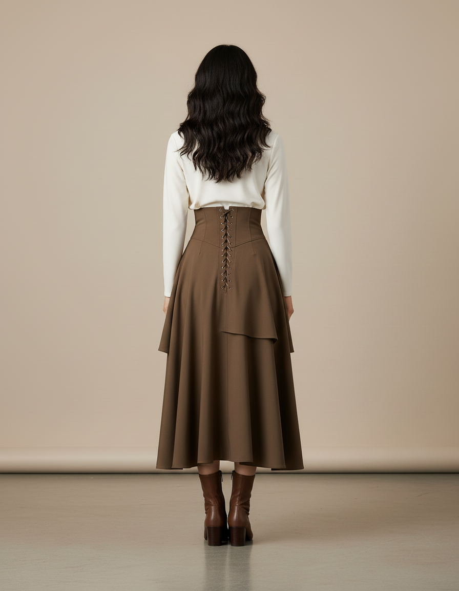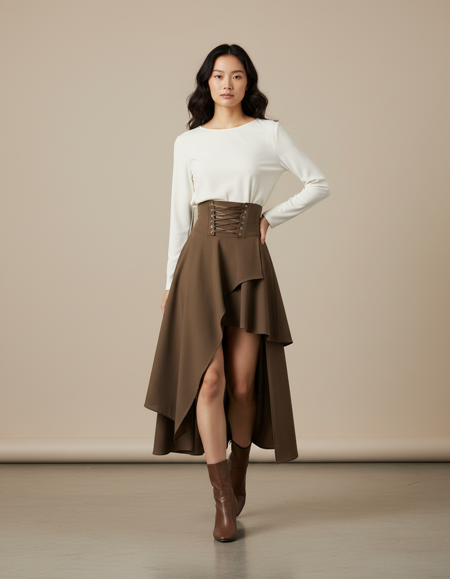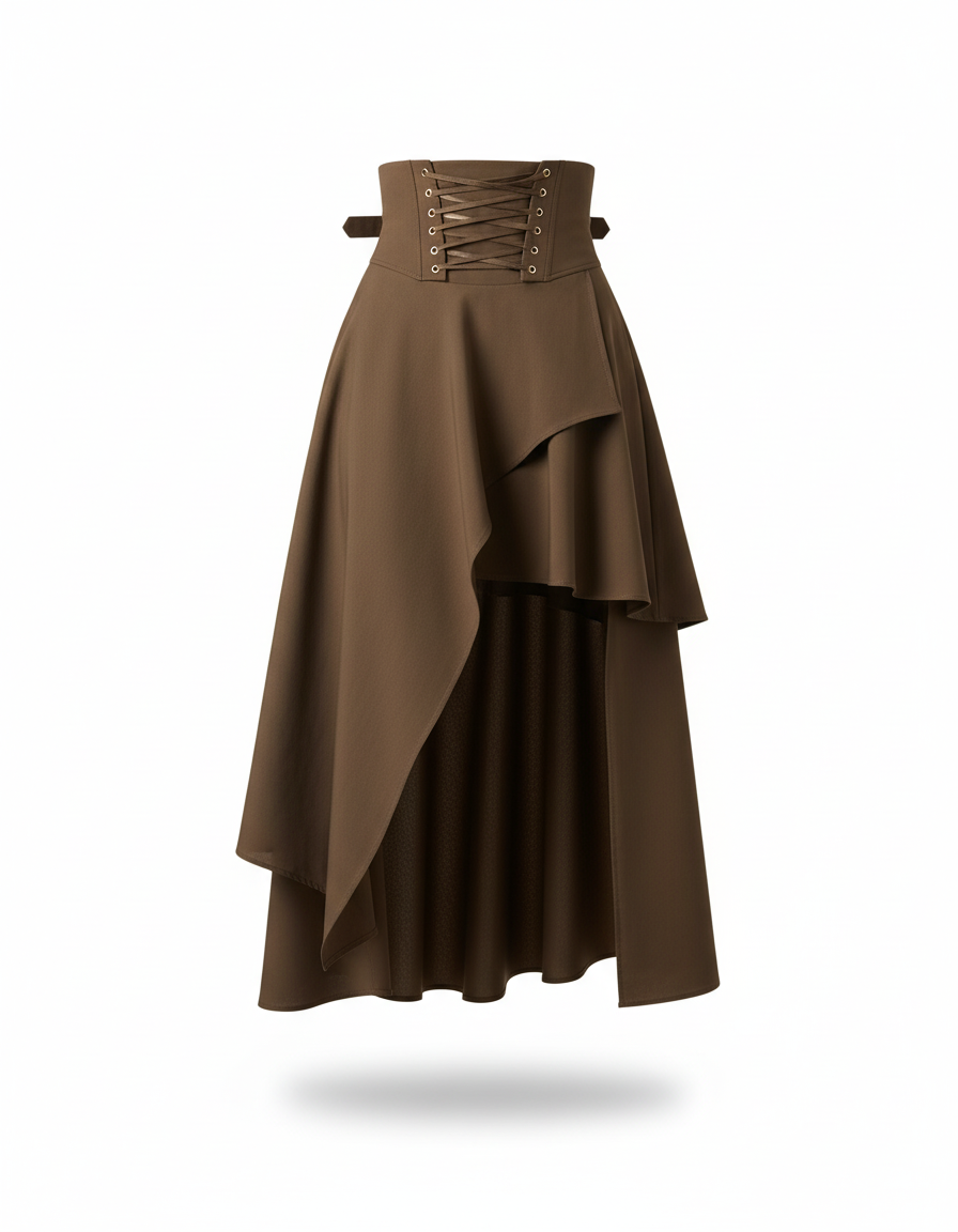 - Coupe : Asymétrique, évasée, taille haute avec large ceinture lacée