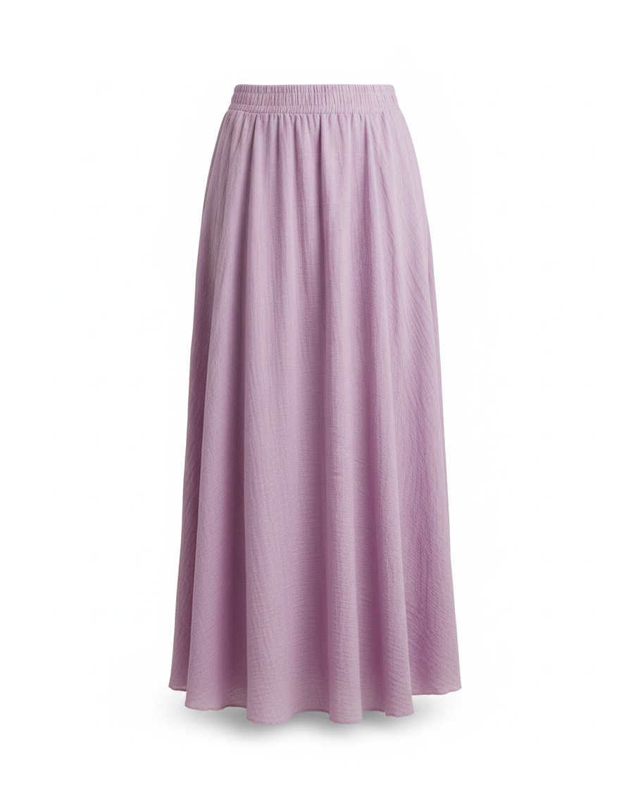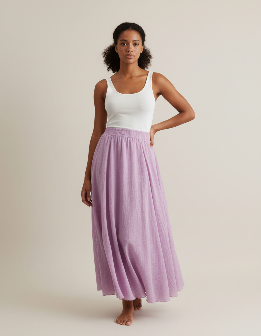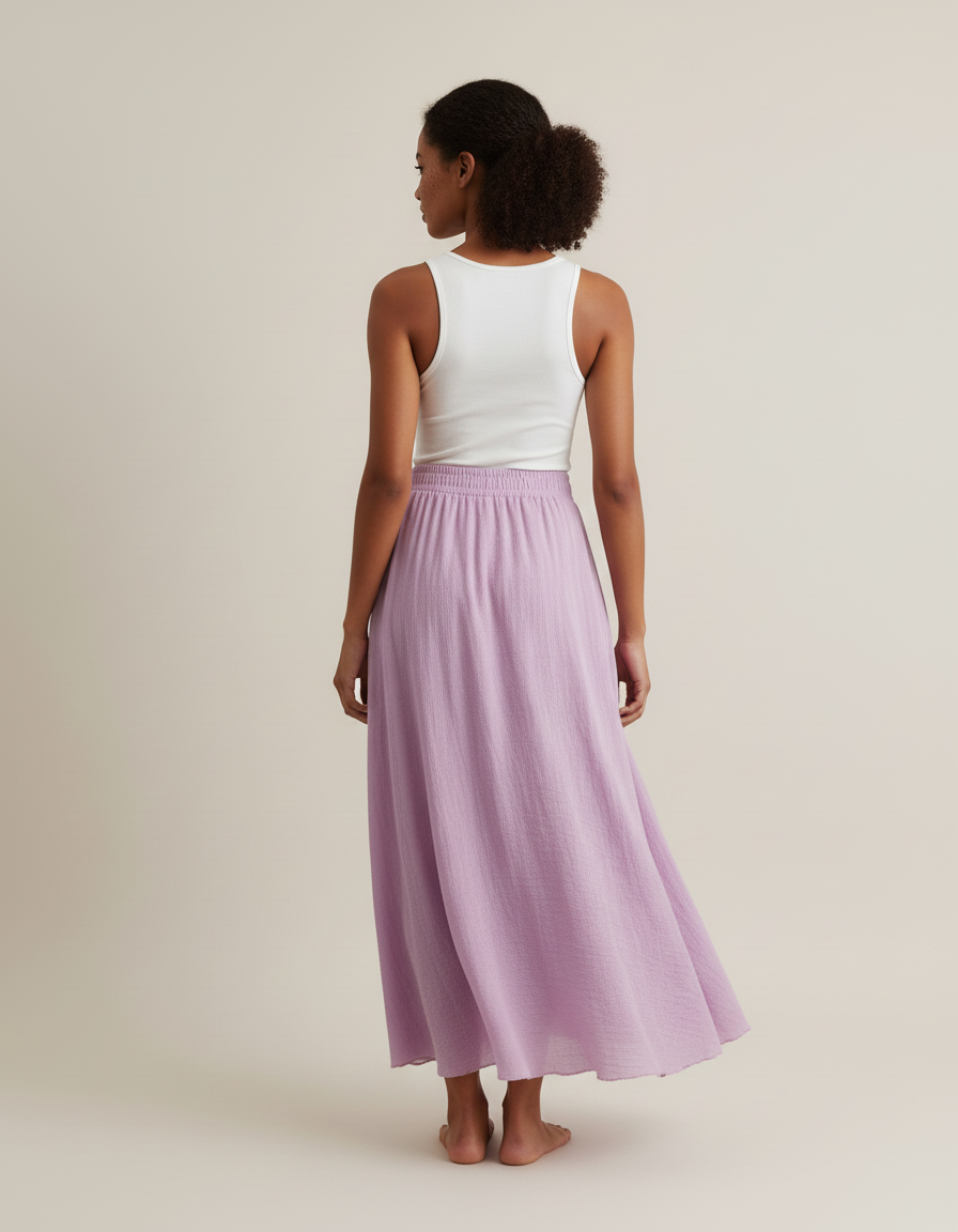 Confectionnée dans un coton pur et respirant, cette jupe se distingue par sa texture subtilement froissée et sa teinte lavande délicate, facile à assortir. Sa taille élastique innovante garantit un confort inégalé et une adaptation parfaite à toutes les morphologies, épousant vos formes avec une discrétion luxueuse. C'est la pièce maîtresse qui transforme instantanément votre tenue, offrant une polyvalence rare pour une garde-robe moderne et consciente. Découvrez le luxe d'une élégance sans effort.