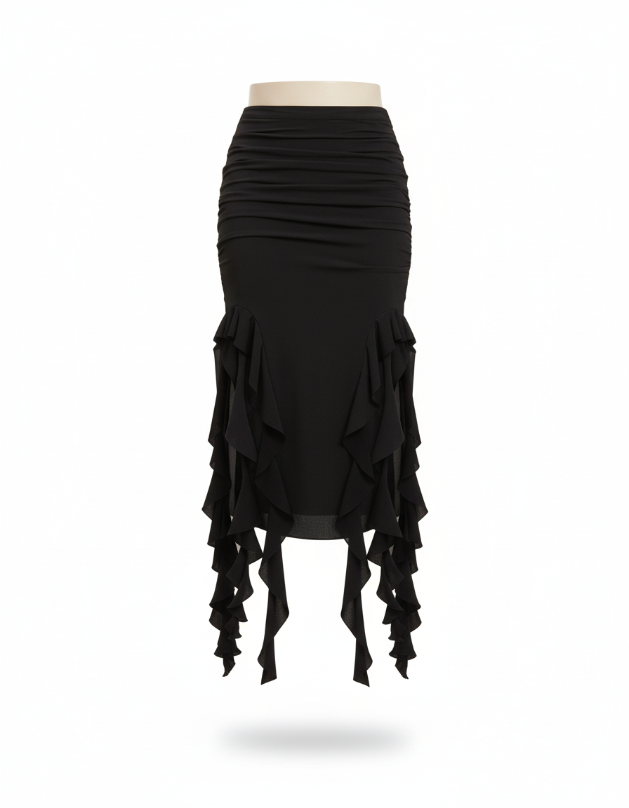 Cette jupe longue est de couleur noire et présente une coupe ajustée avec des fronces au niveau de la taille et des hanches. Son ourlet est asymétrique et agrémenté de volants.