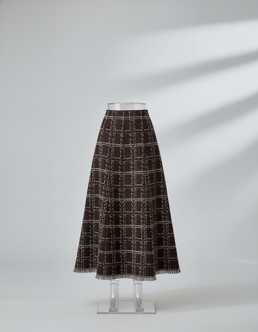 Ce qui la distingue ? Un motif carreaux intemporel, subtilement rehaussé de teintes profondes comme le brun chocolat et l'écru, qui confère une dimension visuelle riche et polyvalente. Sa coupe évasée, associée à une longueur élégante et une finition frangée délicate à l'ourlet, insuffle une touche de modernité audacieuse. Portez-la avec des bottes pour un look hivernal ou des talons pour une sophistication accrue. Cette jupe n'est pas seulement un vêtement, c'est une déclaration de style, un investissement dans un luxe concret et intemporel qui sublime chaque instant.