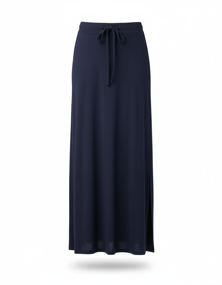 Cette jupe longue est confectionnée en maille avec une coupe fluide. Elle est de couleur bleu marine et présente une fente latérale ainsi qu'une taille avec cordon de serrage.