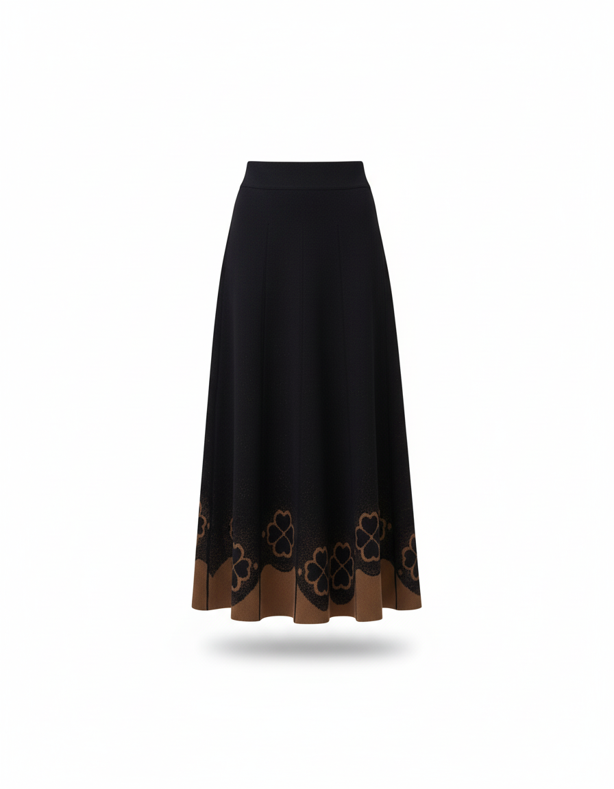 Cette jupe longue est confectionnée en maille de couleur noire. Le bas de la jupe présente un motif contrastant.