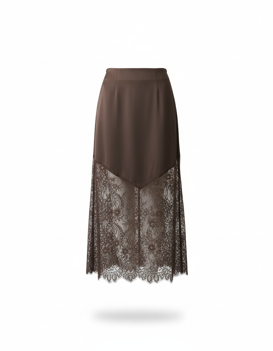 Cette jupe longue est de couleur marron, avec une section supérieure opaque et une section inférieure en dentelle. Sa longueur descend jusqu'aux chevilles.