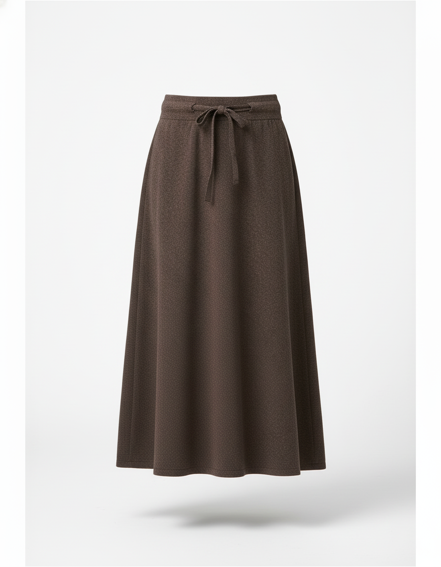 Cette jupe est un modèle long de couleur marron, caractérisée par sa coupe en ligne A. Elle présente une taille haute ajustable avec un cordon de serrage.