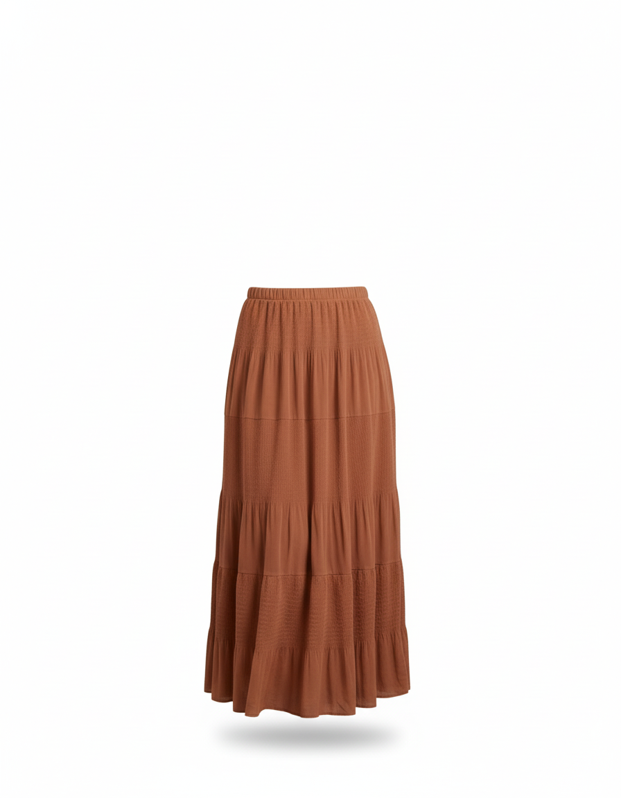 Cette jupe longue marron étagée fluide est la pièce parfaite pour un style décontracté et élégant.