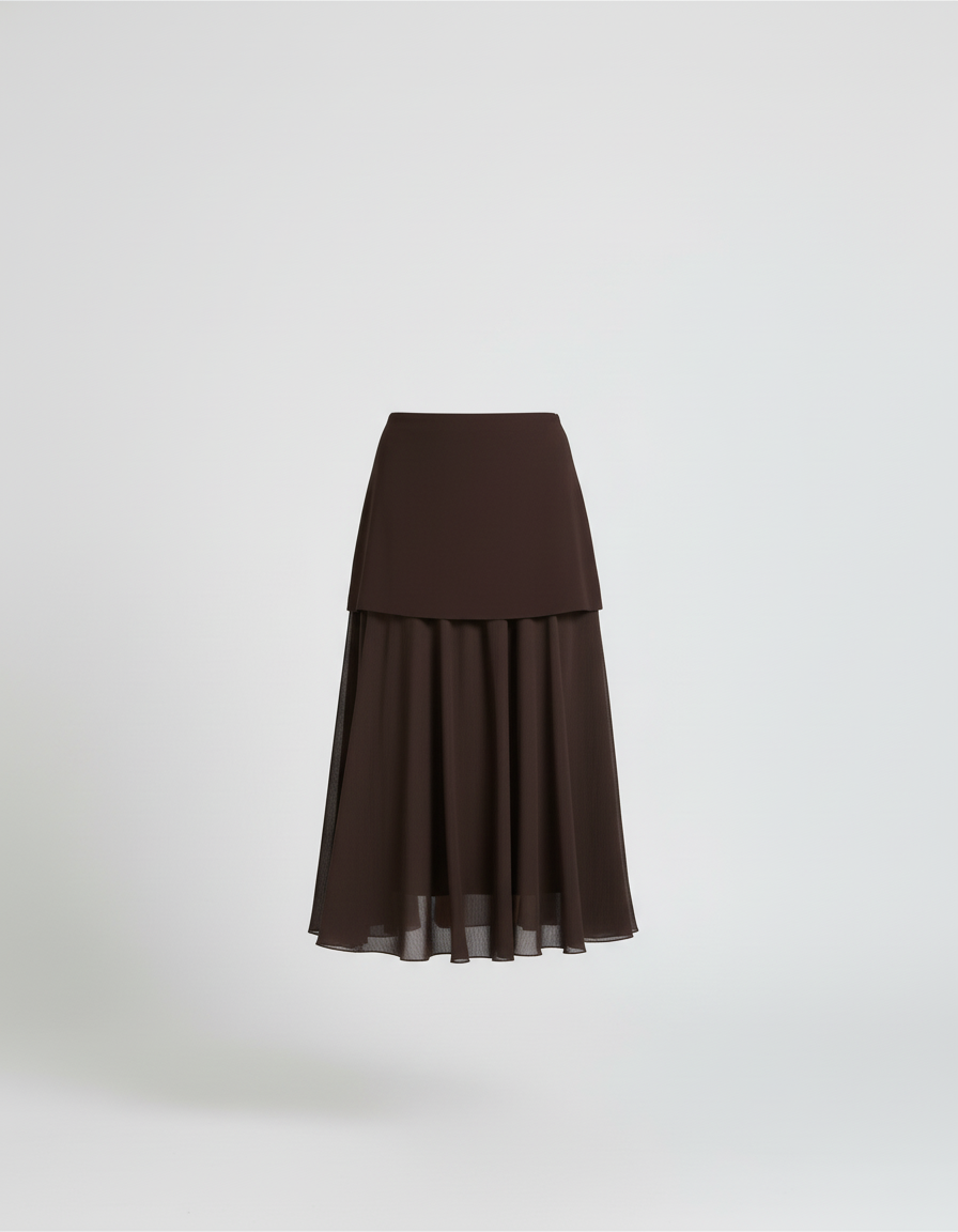 Cette jupe longue est de couleur marron et présente une conception à deux couches. Sa coupe est évasée sur la partie inférieure.