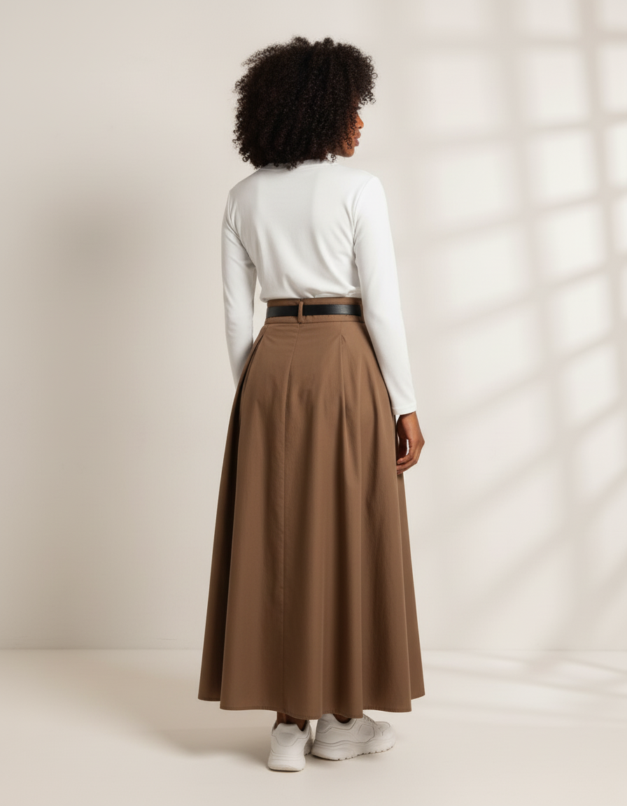 Découvrez notre jupe longue plissée marron, l'alliée parfaite pour un look à la fois chic et décontracté.