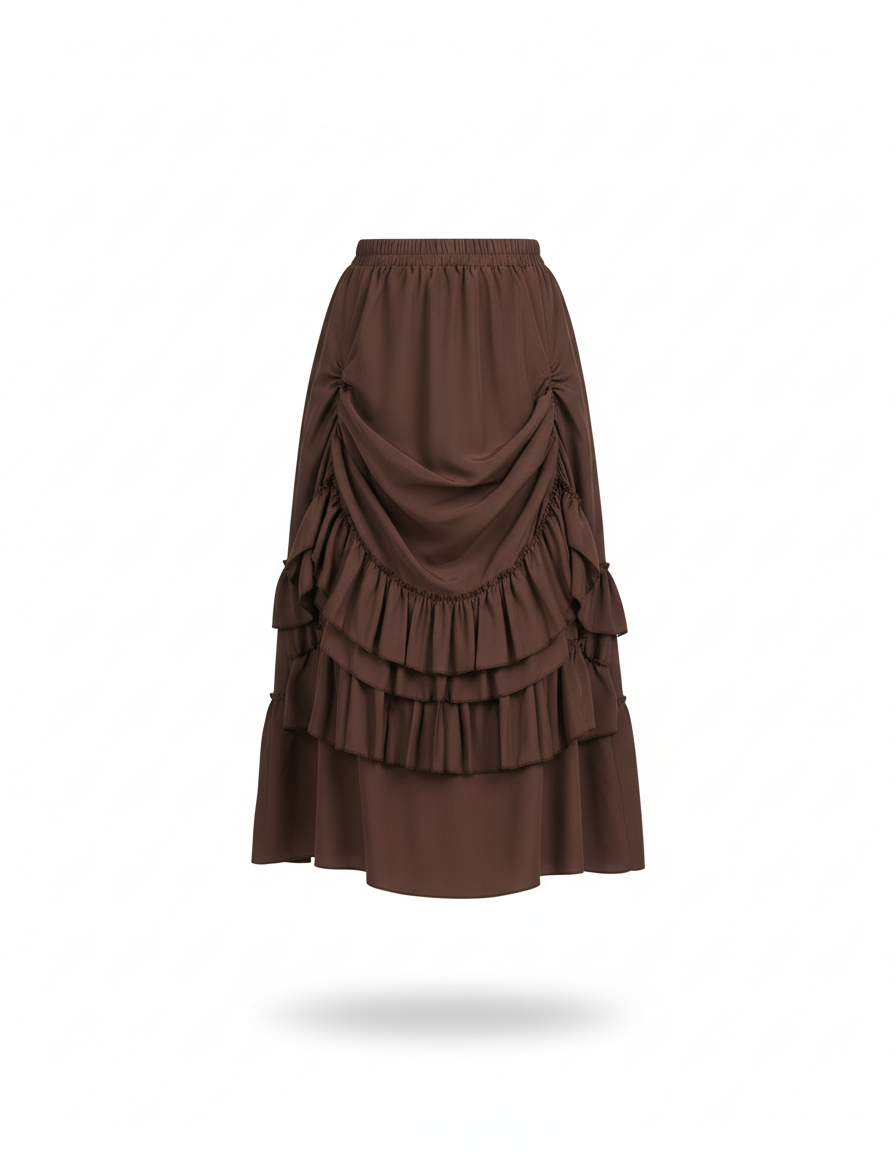 Cette jupe longue pour femme est de couleur marron. Elle présente des volants et des fronces sur sa longueur.