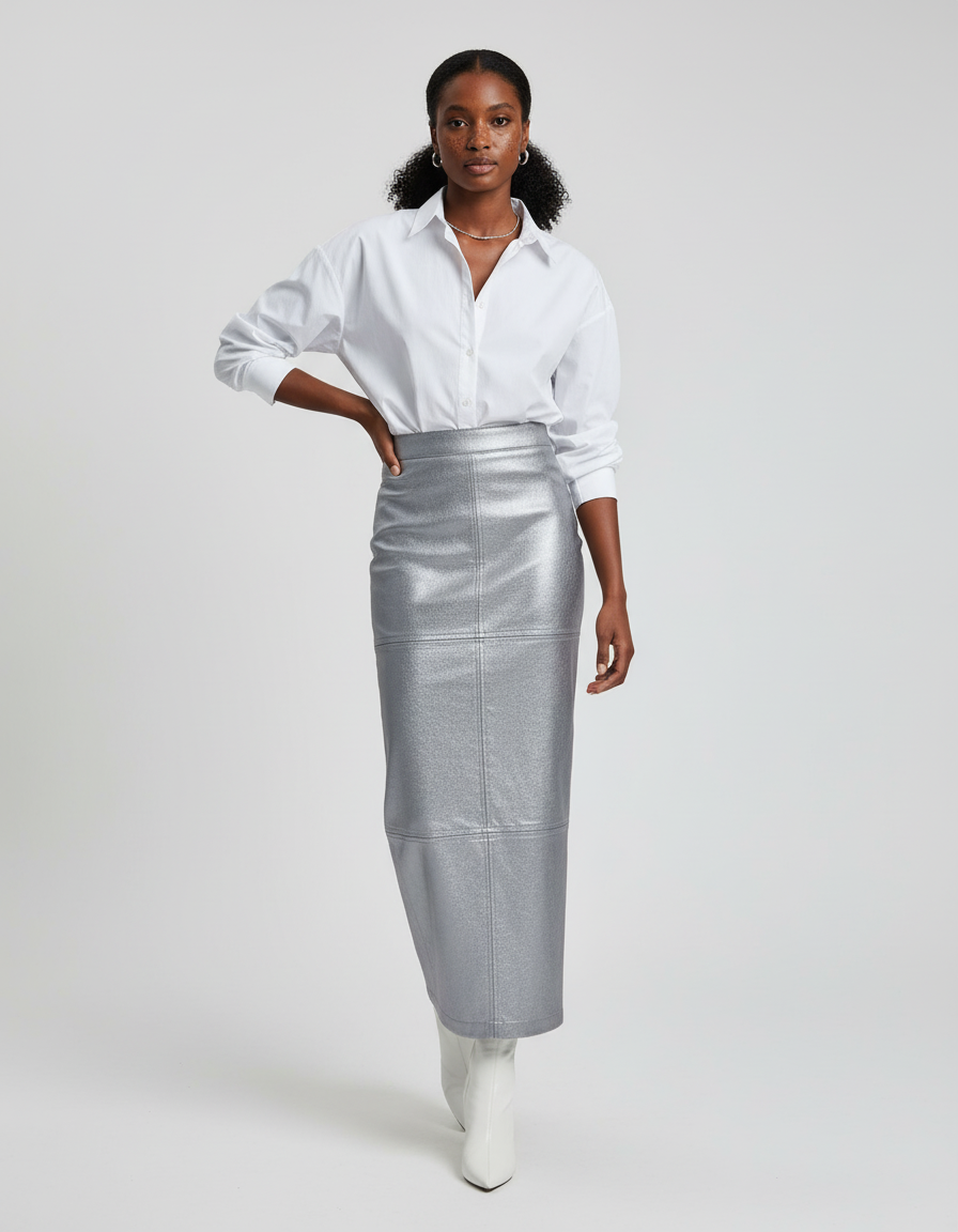 Découvrez la Jupe Longue Métallisée Simili Cuir Chic, pièce maîtresse de votre garde-robe audacieuse. Sa silhouette tube moulante, sublimée par une teinte grise métallique éclatante, capte la lumière et les regards. Idéale pour une soirée mémorable, associez-la à une blouse en soie fluide et des talons aiguilles pour une élégance intemporelle. Pour une allure résolument moderne et sophistiquée, osez le contraste avec une chemise blanche impeccable, comme le montre notre modèle, et des bottines pointues pour une touche urbaine chic.
