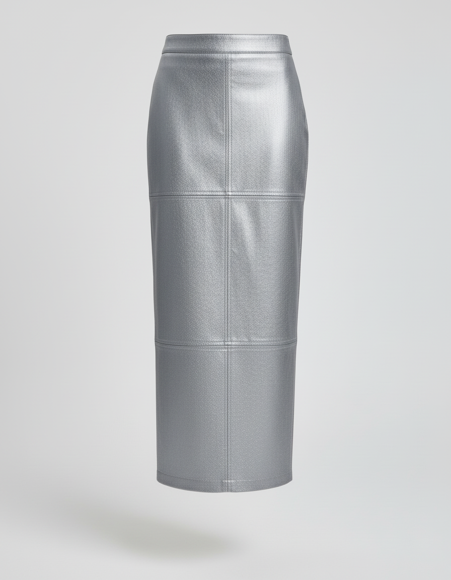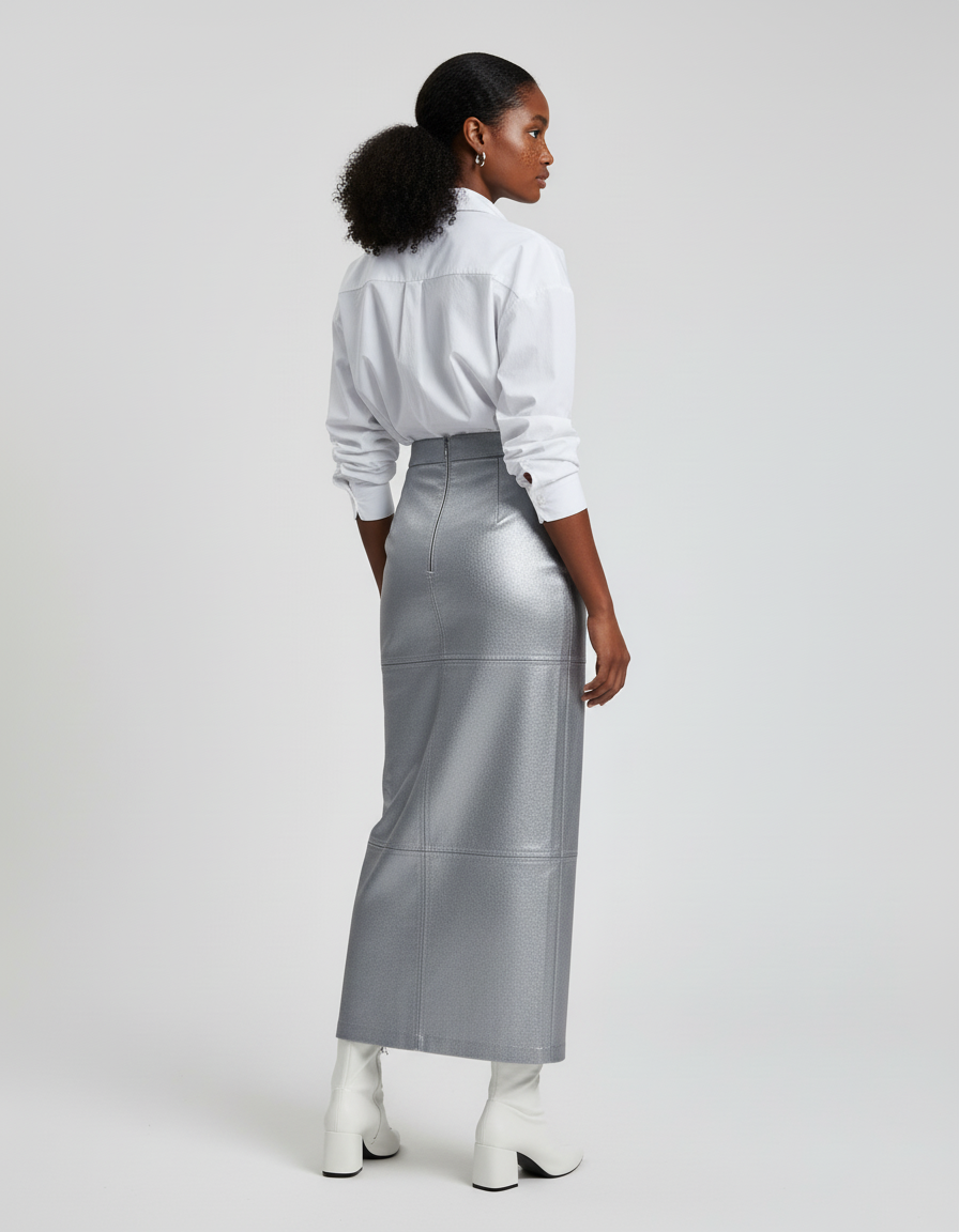 Dévoilez une allure résolument contemporaine avec notre Jupe Longue Métallisée Simili Cuir Chic. Conçue pour la femme audacieuse qui ne transige pas sur l'élégance, cette jupe moulante style tube est bien plus qu'un vêtement : c'est une affirmation de style. Son fini métallique gris argenté capte la lumière avec une subtilité raffinée, vous assurant de briller en toute circonstance, du bureau aux soirées les plus exclusives. Elle sculpte la silhouette avec grâce, offrant une confiance inébranlable et un confort surprenant grâce à sa matière innovante.