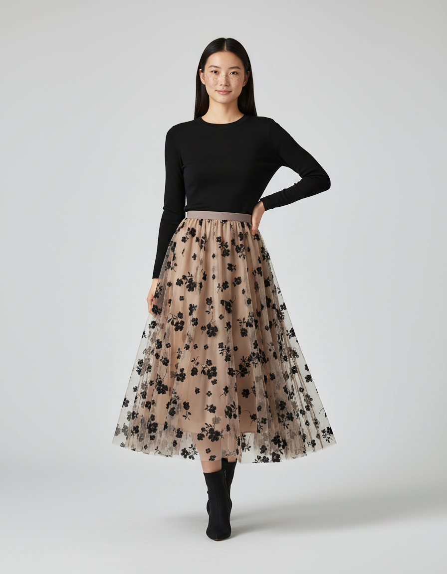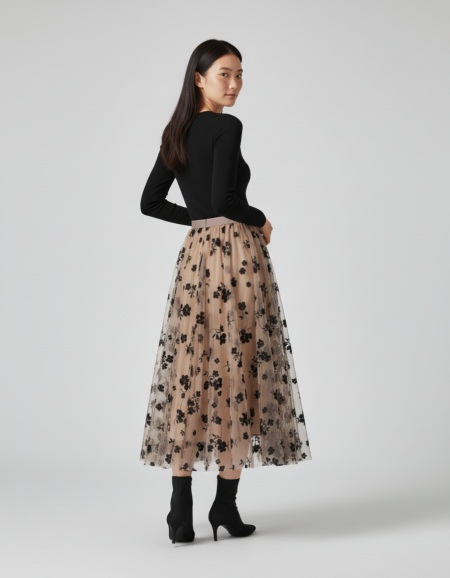 Révélez une sophistication audacieuse avec notre Jupe Longue Moderne, une pièce maîtresse conçue pour la femme qui ose affirmer son style. Laissez-vous séduire par son volume aérien en tulle délicatement brodé de motifs floraux, offrant une silhouette évasée qui danse à chacun de vos pas. Cette jupe n'est pas qu'un vêtement, c'est une invitation à l'expression de soi, un équilibre parfait entre le rêve et la réalité. Son design unique transforme instantanément n'importe quelle tenue, vous assurant une présence mémorable, que ce soit pour une occasion spéciale ou pour sublimer votre quotidien d'une touche de raffinement.