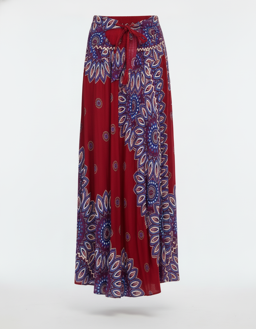 Adoptez un look bohème chic avec notre superbe jupe longue dotée d'un motif complexe et coloré.