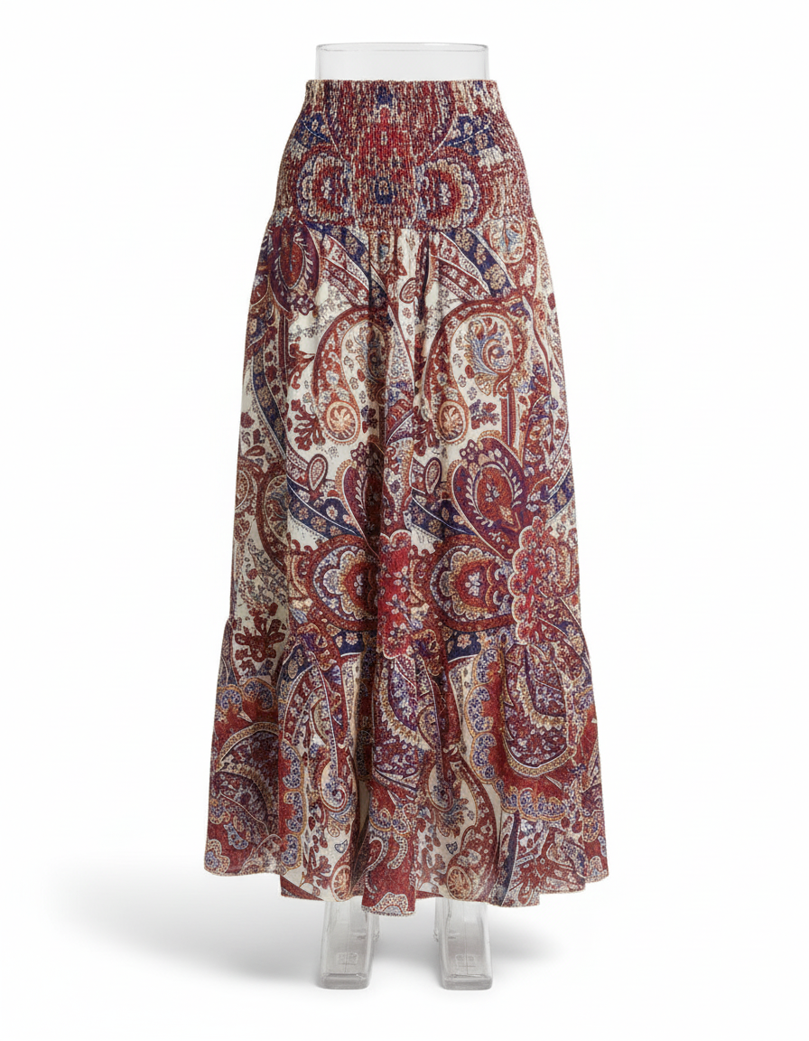 ``Ce vêtement présente une coupe longue et une taille smockée. L'ensemble de la jupe est couvert d'un motif détaillé.