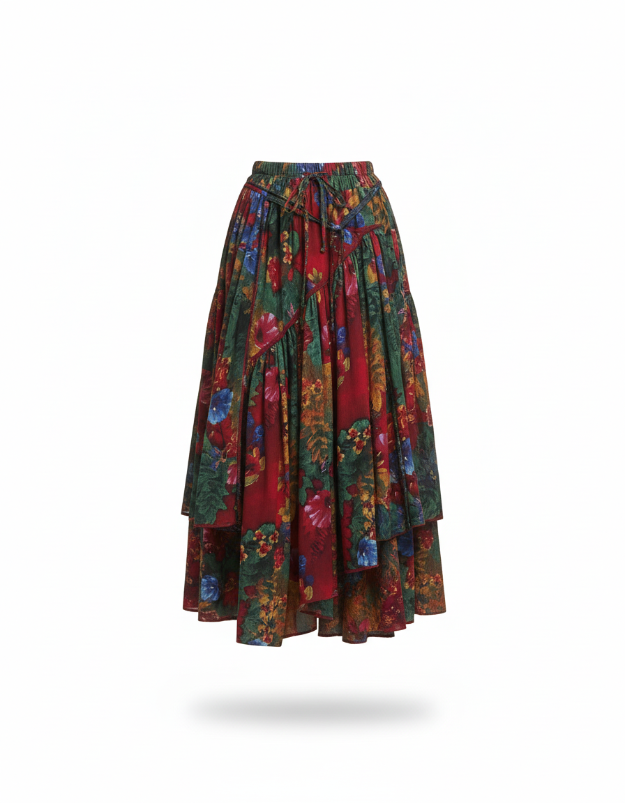 Cette jupe longue se caractérise par un motif floral multicolore sur un fond aux teintes de rouge et de vert. Sa coupe est fluide, avec des volants en cascade.