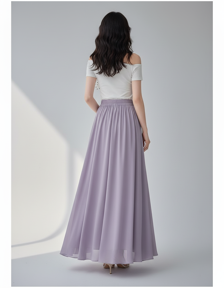 Adoptez l'élégance aérienne avec notre jupe longue en mousseline lavande, parfaite pour un look frais et féminin.