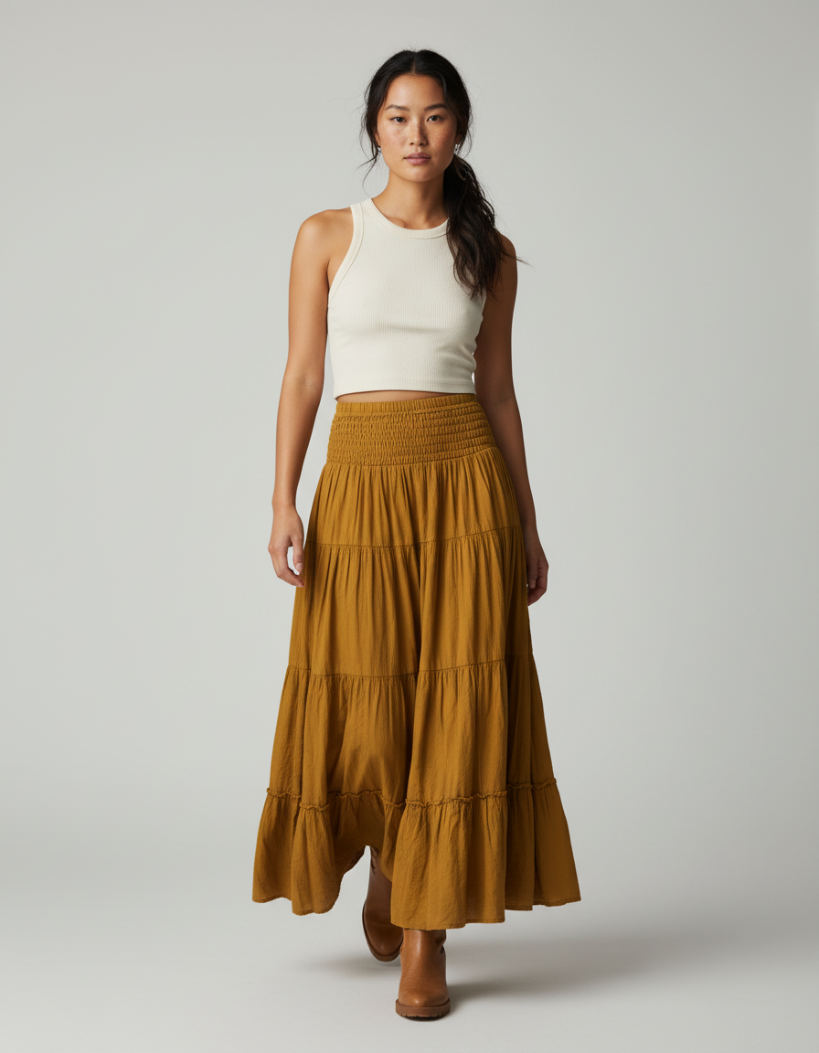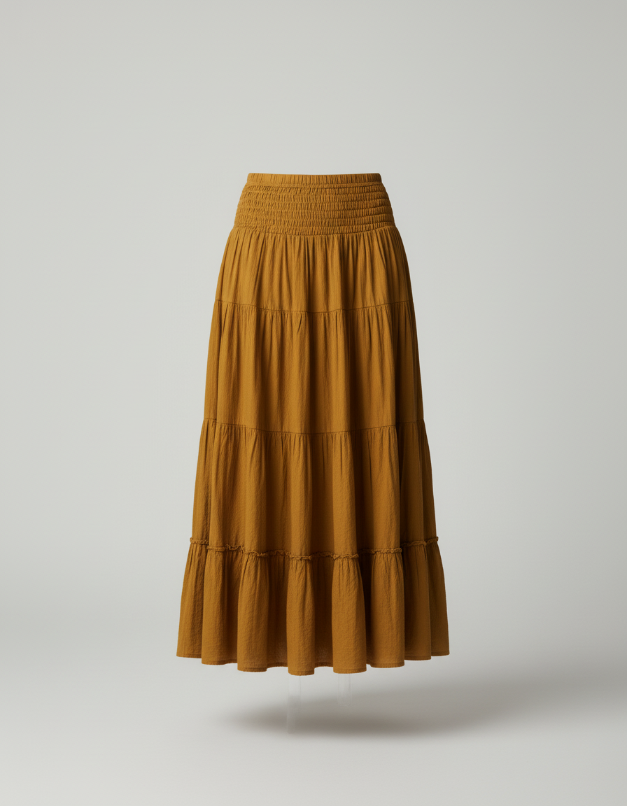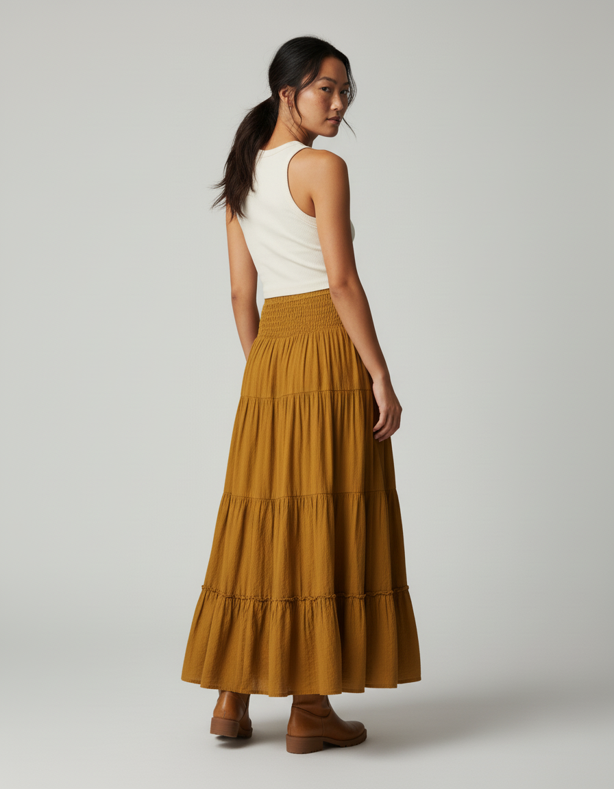 L'Élégance Bohème Réinventée : Jupe Longue Moutarde Étagée