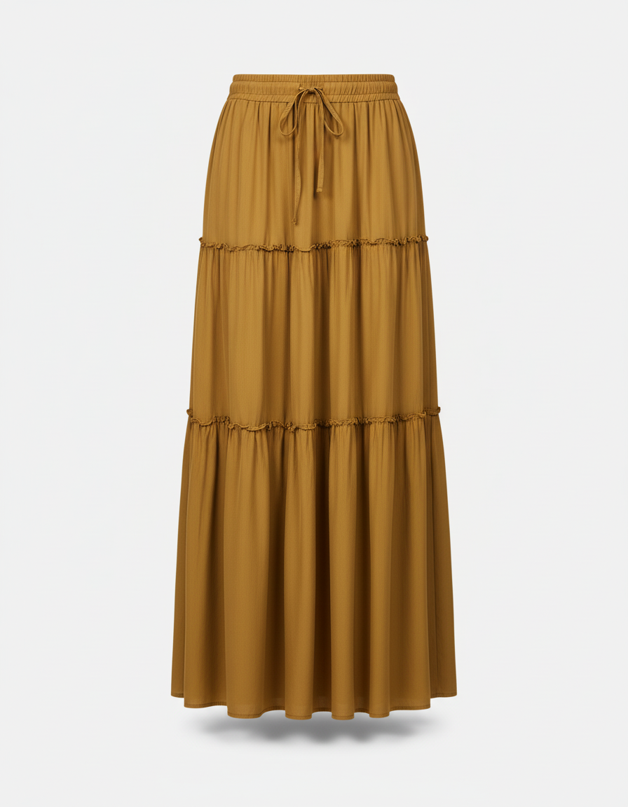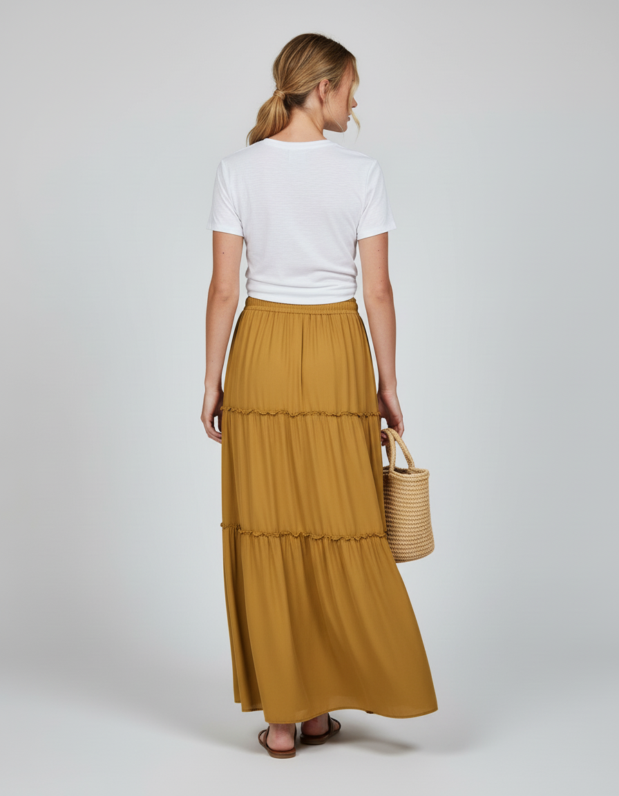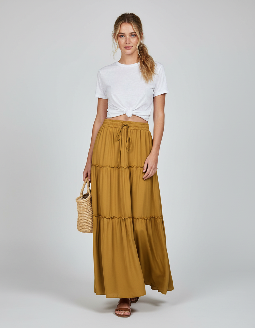 Adoptez un look bohème chic avec notre jupe longue moutarde étagée, parfaite pour une allure décontractée et élégante.