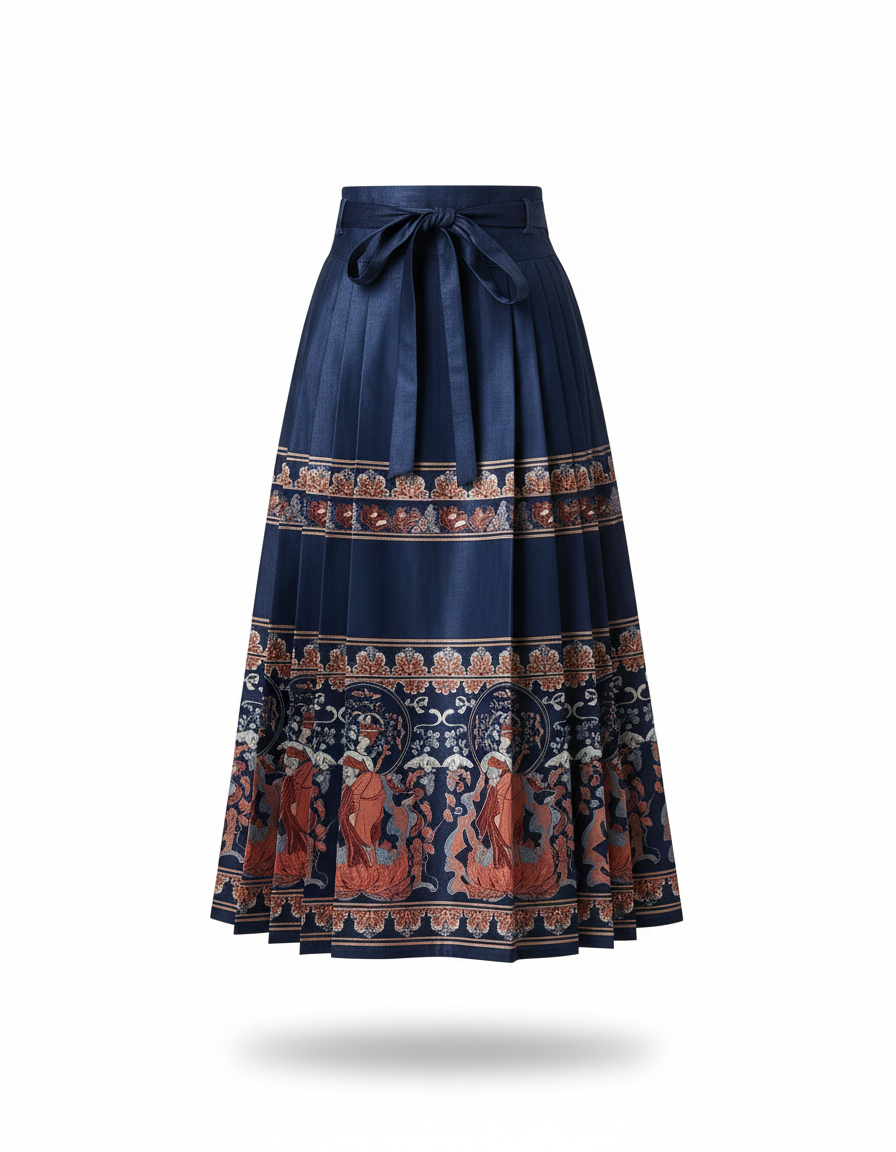 - Motif : Imprimé décoratif sur la partie basse de la jupe, avec des figures et des éléments floraux.