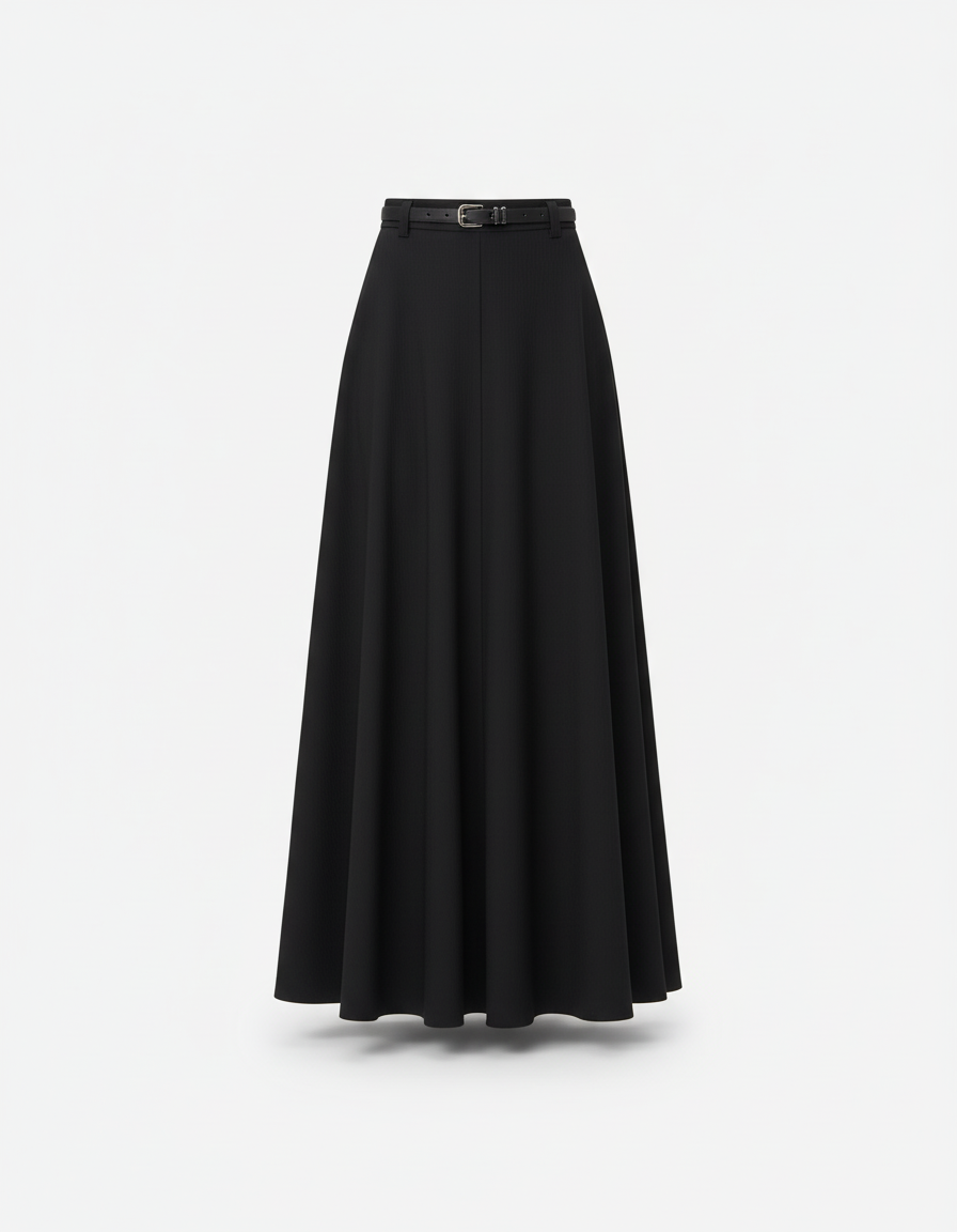 Cette jupe longue peut être portée pour des tenues quotidiennes ou des sorties. Sa coupe structurée permet diverses combinaisons de styles.