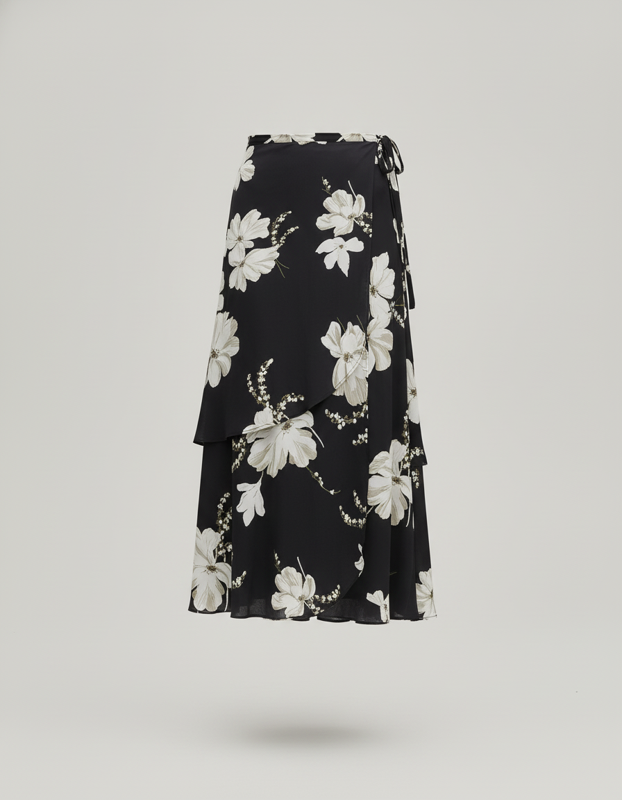 Ce qui distingue notre jupe portefeuille, c'est son imprimé floral blanc éclatant sur un fond noir profond, une œuvre d'art textile qui capture la beauté intemporelle. Le satin de haute qualité assure un drapé parfait et un toucher luxueux, tandis que sa coupe portefeuille ajustable s'adapte harmonieusement à chaque morphologie, soulignant subtilement la taille et allongeant la silhouette. Plus qu'une simple jupe, c'est une déclaration de style, une pièce unique qui affirme votre élégance avec une touche de modernité concrète.