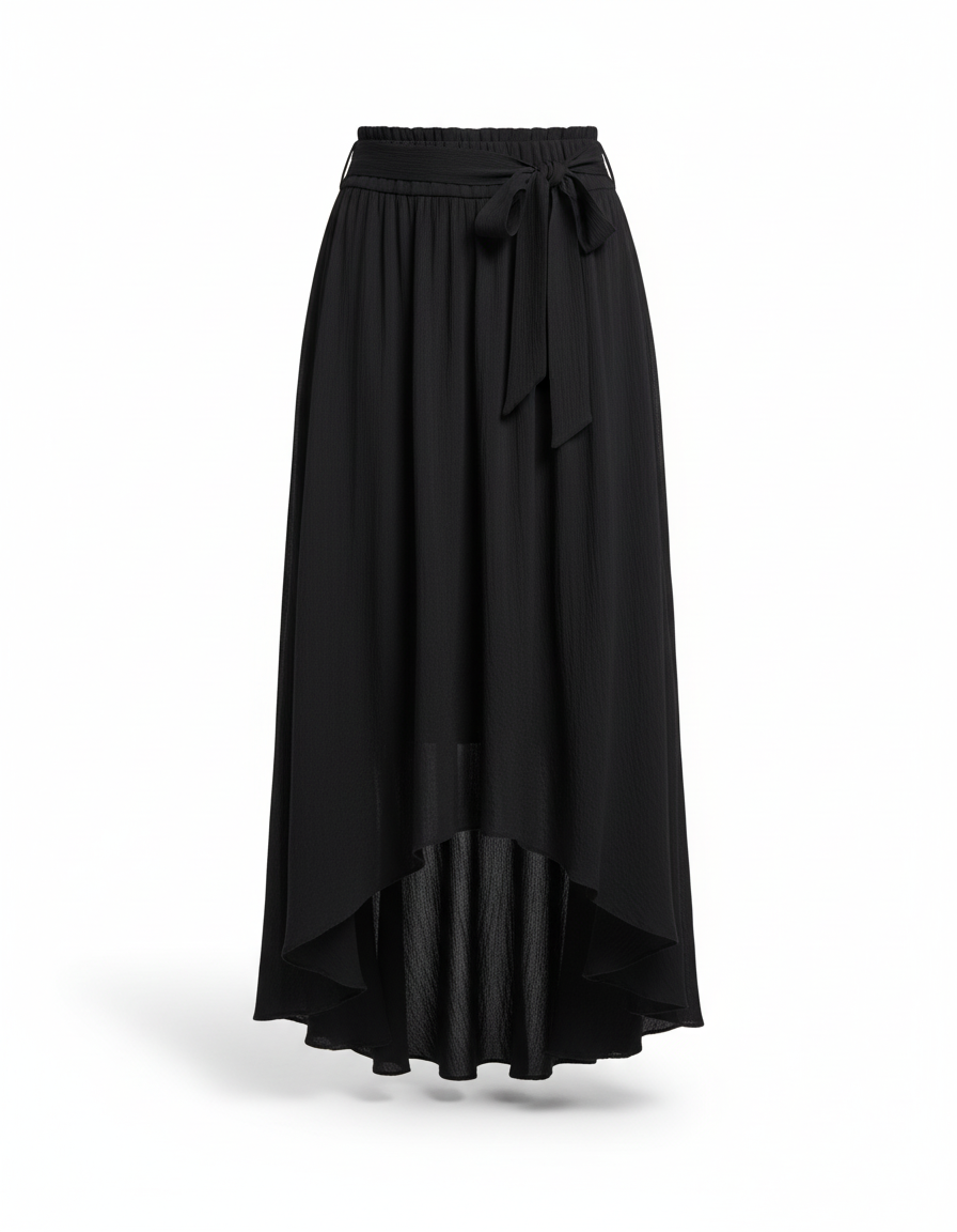 Adoptez l'élégance décontractée avec notre jupe longue noire asymétrique fluide, parfaite pour toutes les occasions.