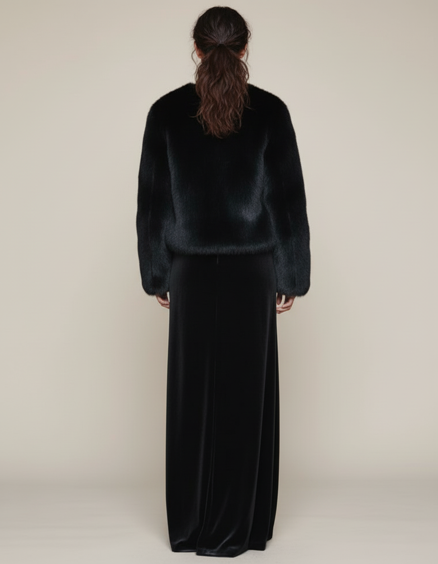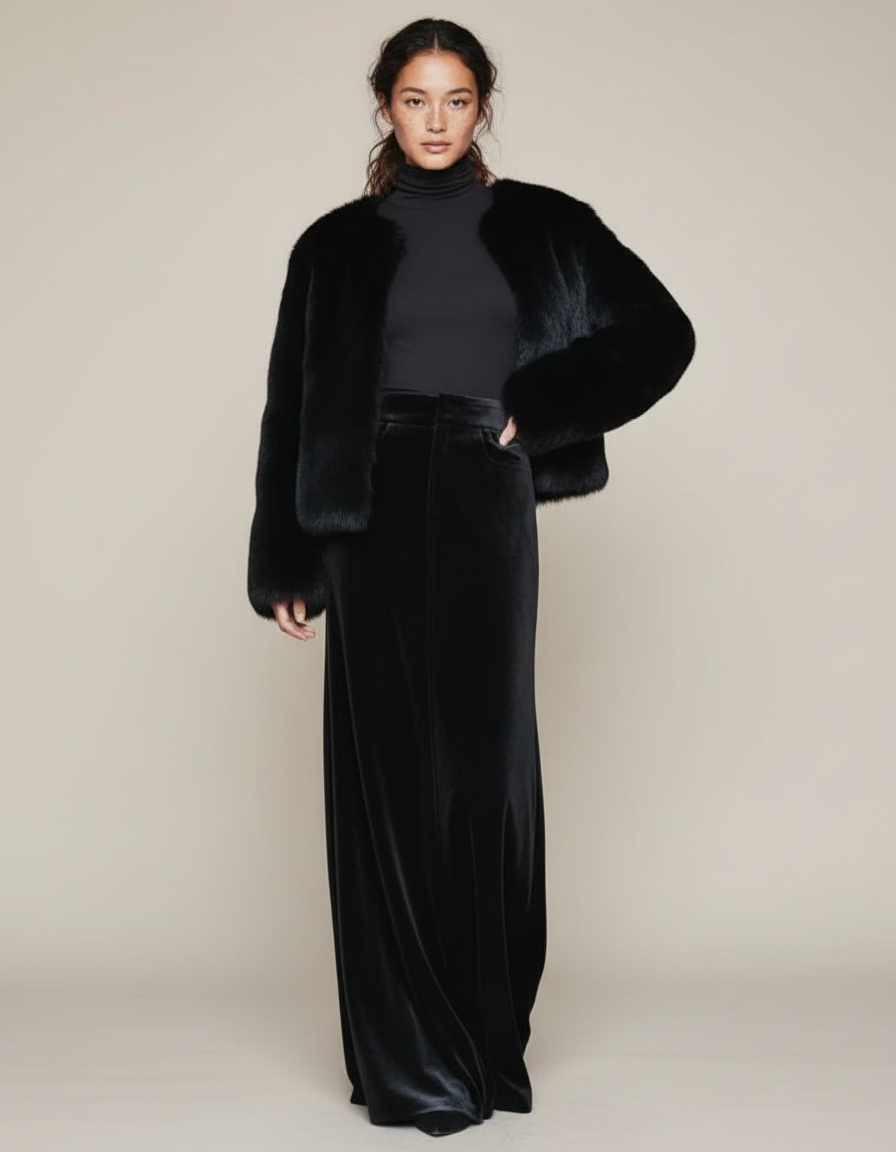 Découvrez la Jupe Longue Noire Avec Poches, une pièce emblématique conçue pour sublimer vos soirées. Son velours fluide d'un noir intense et sa coupe droite intemporelle en font un incontournable de votre dressing haut de gamme. Pour une allure sophistiquée, associez-la à un top en soie ajusté et des talons aiguilles. En quête d'un style plus audacieux ? Osez le contraste avec un blazer structuré ou, comme sur l'image, une veste courte en fausse fourrure pour une touche de glamour moderne. Les poches discrètes ajoutent une fonctionnalité inattendue, fusionnant praticité et raffinement.