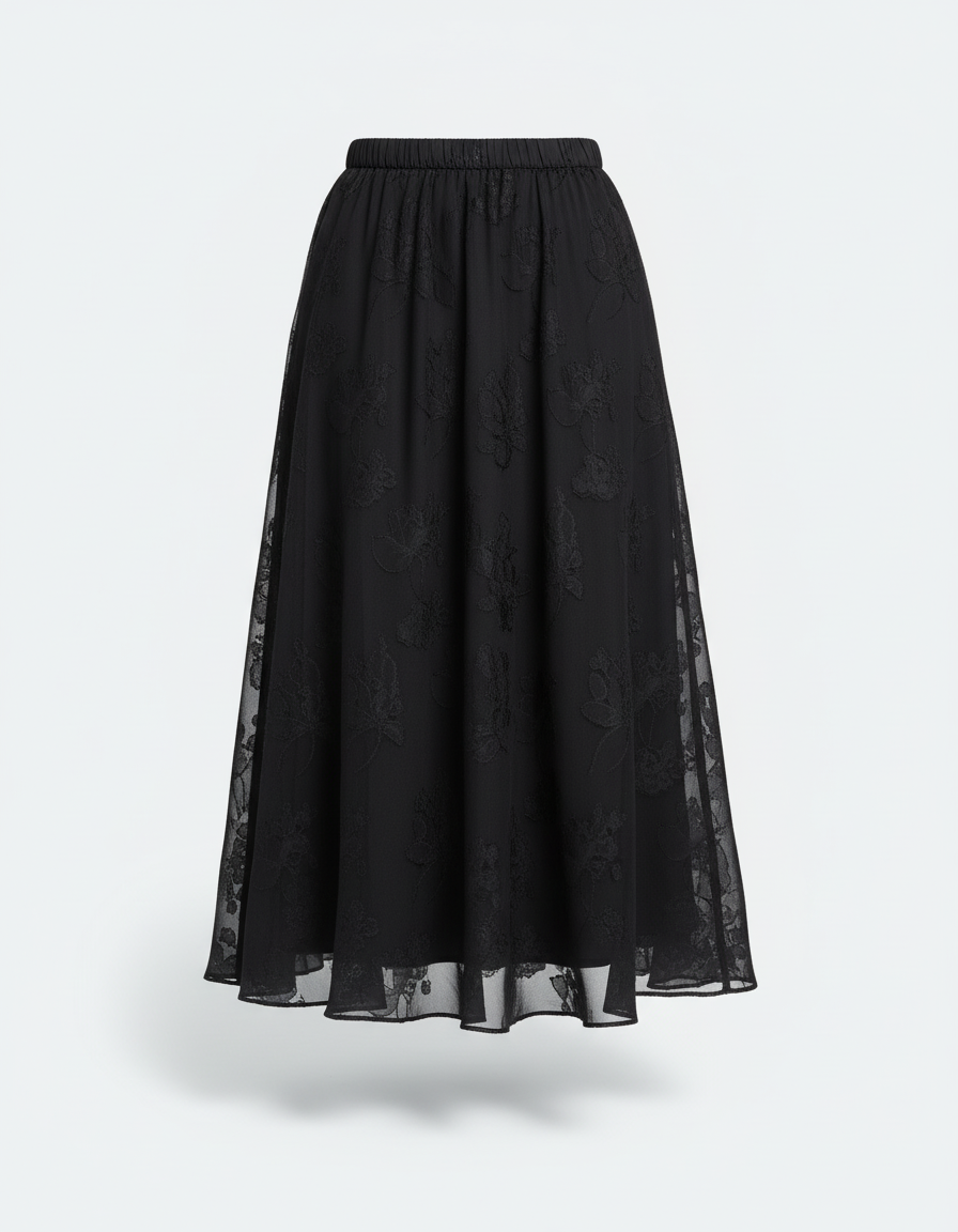 Ce qui la distingue ? Son tissu en mousseline noire délicatement brodée, offrant une texture subtile et un jeu de transparence raffiné. Loin d'être une simple jupe noire, ses motifs floraux discrets et sa coupe évasée créent un mouvement gracieux à chaque pas. C'est la pièce qui transforme un ensemble basique en une tenue d'exception, affirmant votre goût pour le luxe discret et les détails qui comptent. Investissez dans un classique intemporel qui élève votre garde-robe avec une touche de romantisme moderne et une sophistication indéniable.