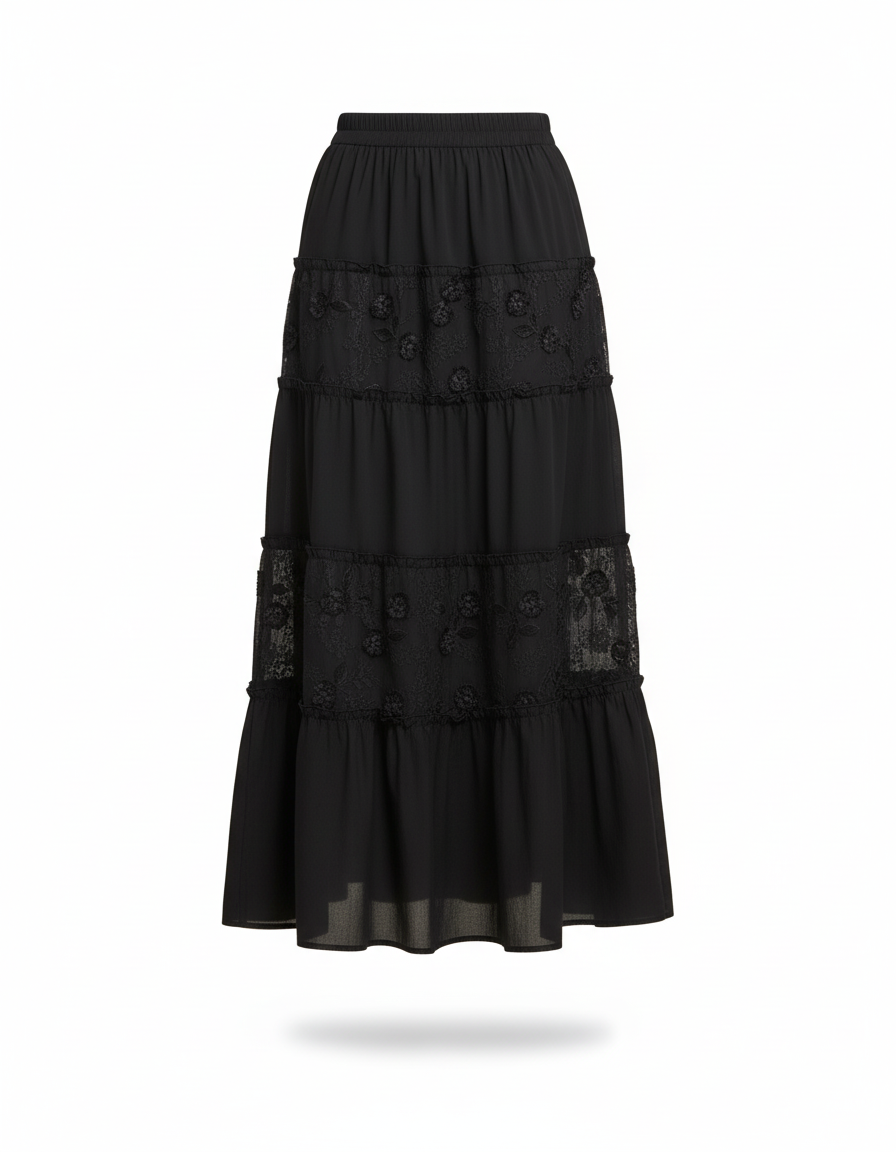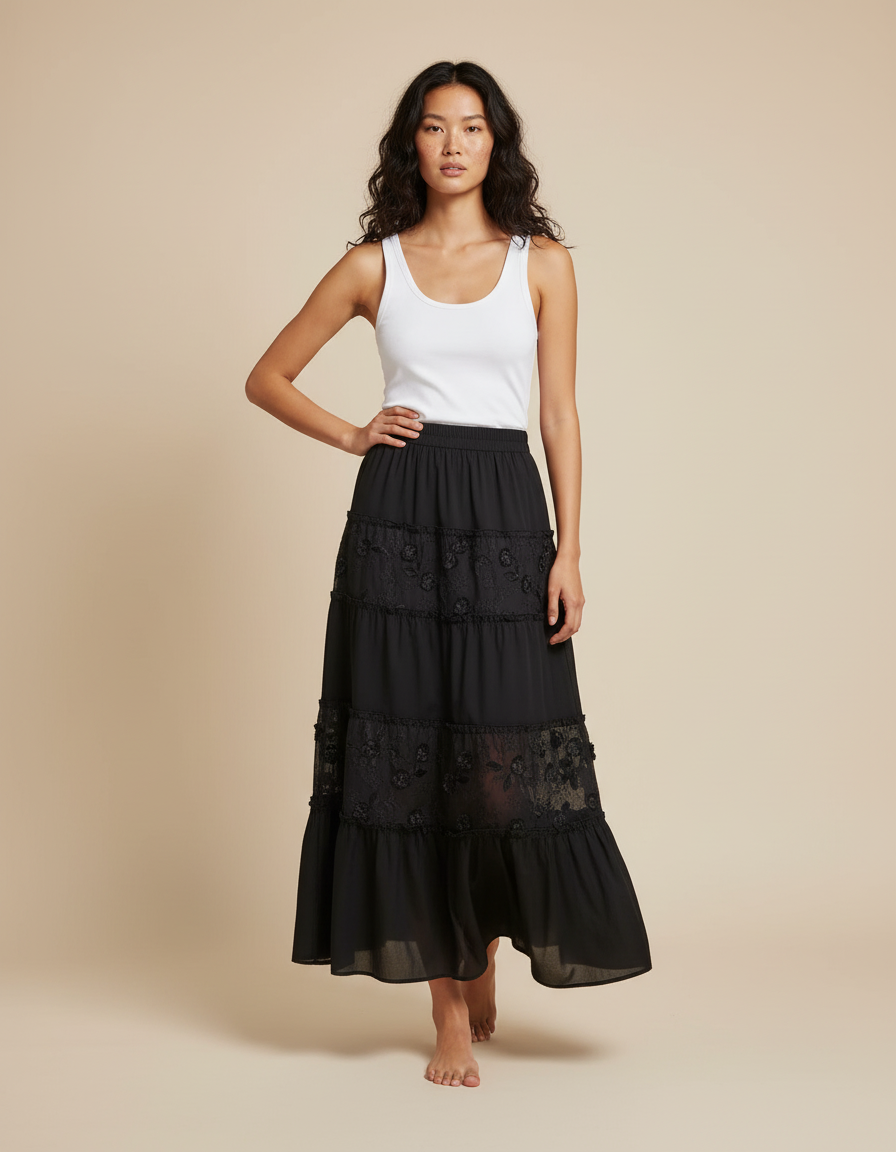 Jupe Longue Noire Brodée Élégante : Modèle à Volants
