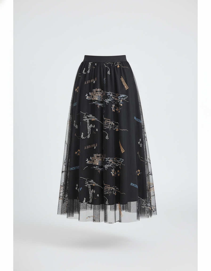 Cette jupe présente une coupe longue et une couleur noire. Elle est pourvue de motifs brodés sur sa surface en voile.