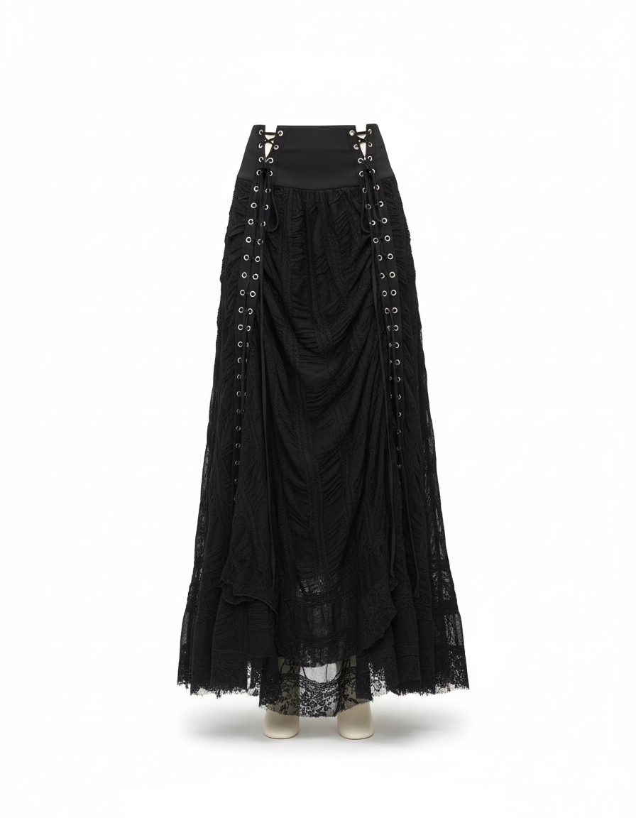 Jupe Longue Noire Dentelle Chic Élégante avec Laçage Latéral