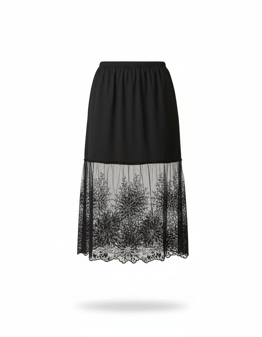Jupe Longue Noire Dentelle Élégante Chic avec superposition brodée