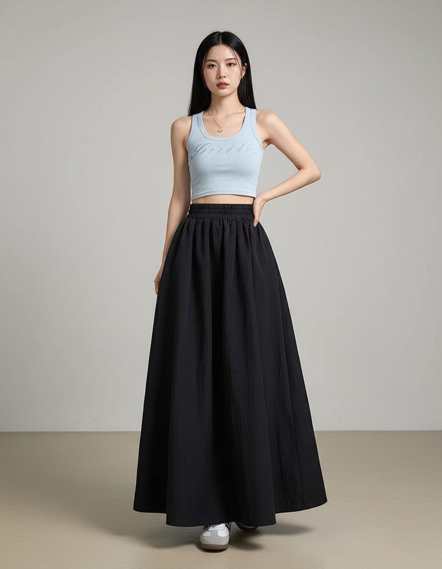La Jupe Longue Noire Évasée Chic est la pièce maîtresse qui transforme votre garde-robe estivale. Son design intemporel et sa couleur noire profonde en font la toile parfaite pour une multitude de looks. Pour une allure décontractée en journée, associez-la à un débardeur léger et des sandales plates, comme notre modèle l'illustre si bien. En soirée, métamorphosez-la avec un top en soie, des bijoux raffinés et des talons pour une élégance sophistiquée. Pour un brunch ou une sortie citadine, une blouse fluide et des espadrilles compléteront un ensemble chic et confortable.